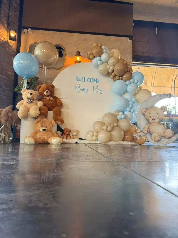 קיר בלונים מעוצב לברית או לאירוע בייבי בסידור רך ונעים, בשילוב בלונים בגווני תכלת, שמנת וחום בהיר. הקיר כולל לוח עגול מרכזי עם כיתוב בהתאמה אישית, קשת בלונים עשירה ואקססוריז משלימים היוצרים אווירה חמה ומרגשת. מתאים כרקע לצילומים ולהצבה בכניסה לאירוע, ומשתלב מושלם באולמות, מסעדות ובתי אירוח.