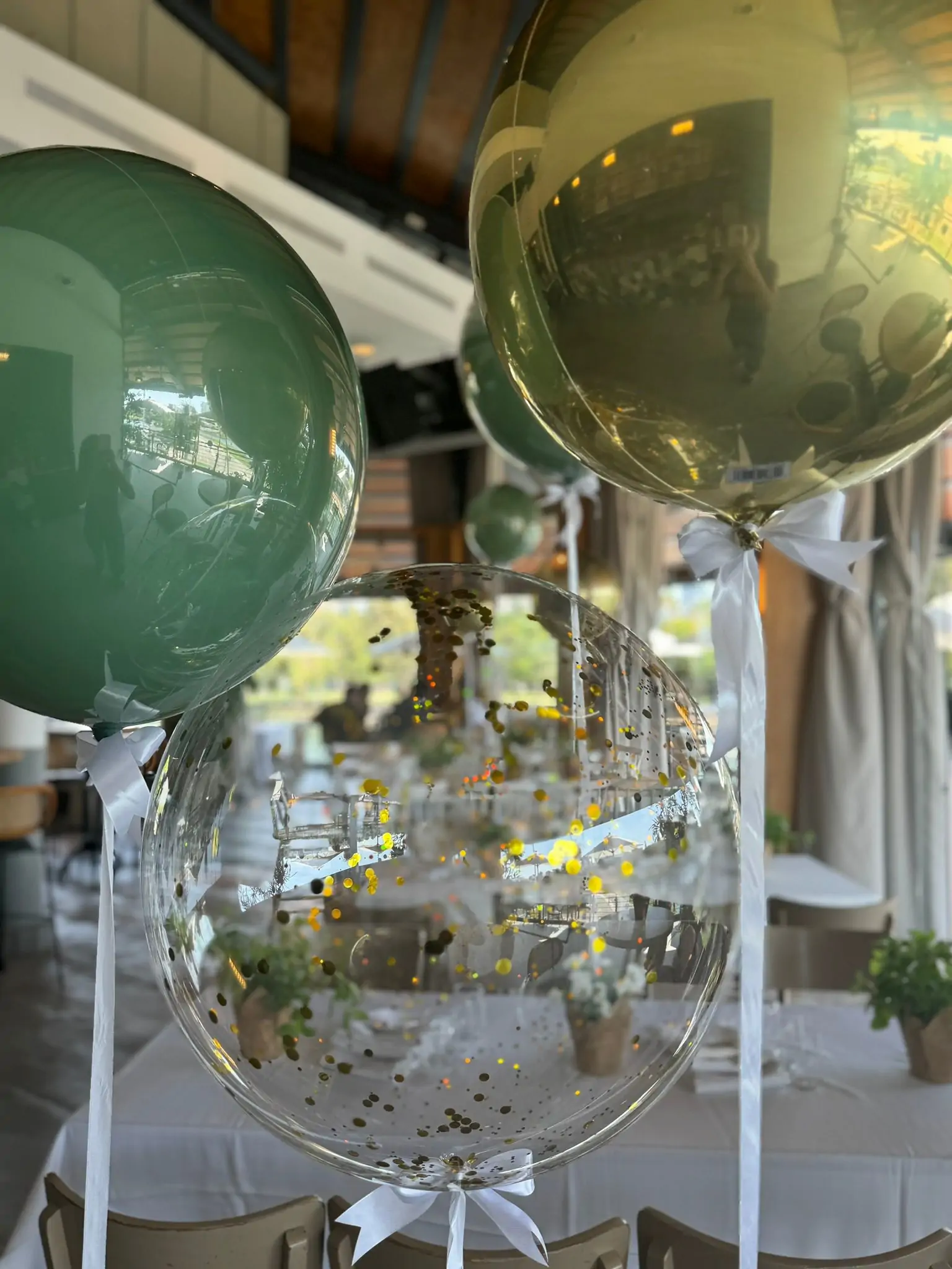 בלון בועה שקוף בסידור אלגנטי הכולל קונפטי בגווני ירוק וזהב, קשור בסרט לבן ומעניק מראה חגיגי ונקי. מתאים להצבה על שולחנות, בכניסה לאירוע או כחלק מסידור כללי, ומשתלב מושלם באירועי בר מצווה, ימי הולדת ואירועים חגיגיים נוספים.