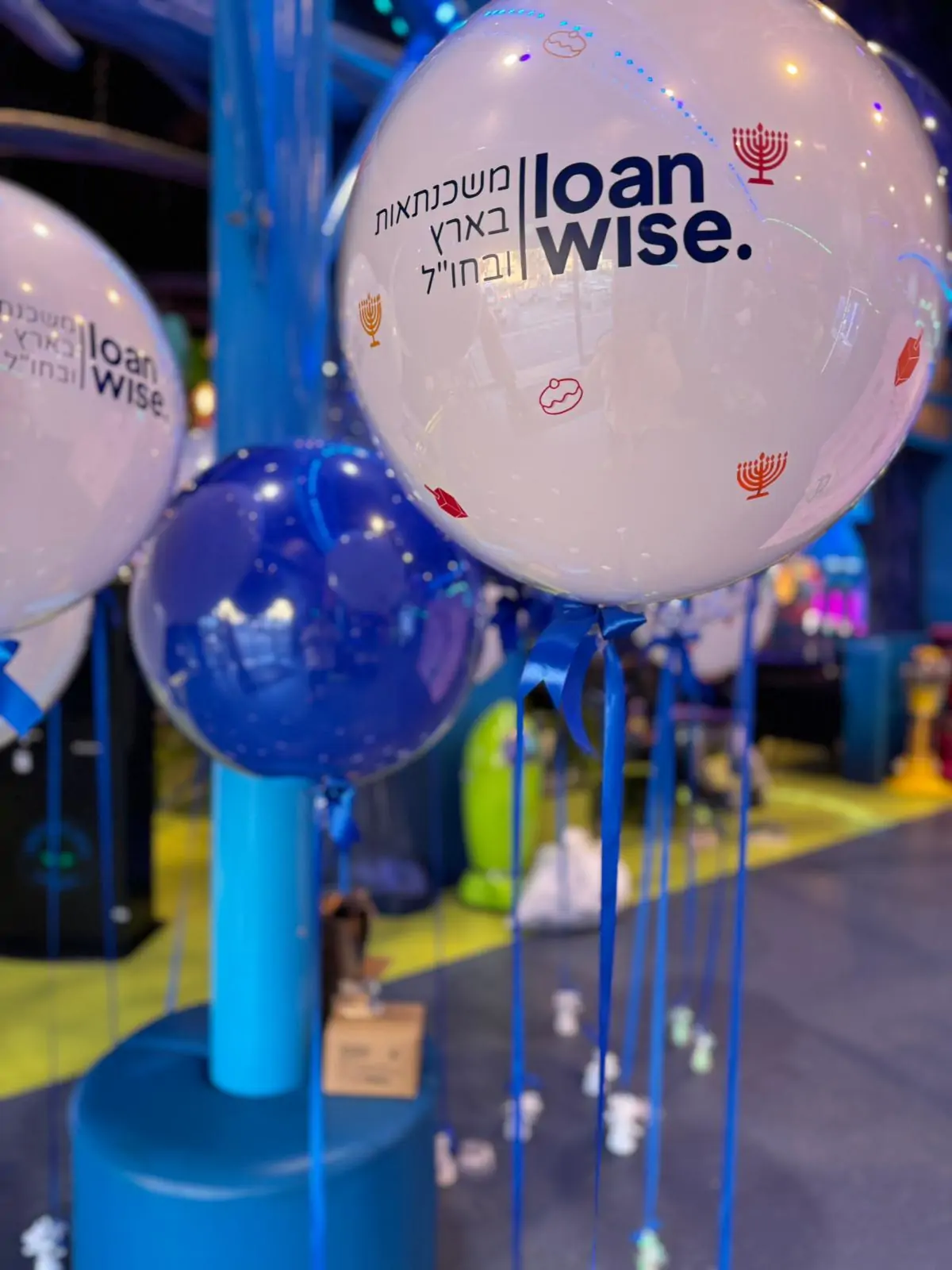 בלון לבן ממותג עם לוגו Loanwise בהדפס נקי וברור, בשילוב סרטים כחולים התואמים לשפת המותג. עיצוב מקצועי שמשדר אמינות, יציבות ונוכחות חזקה בשטח. מתאים במיוחד לאירועי חברה, פעילויות קד"מ, השקות ומתחמים עסקיים, ומייצר חשיפה חכמה למותג עם מראה ייצוגי ומכובד שמצטלם מעולה ומושך תשומת לב בלי להיות צעקני.