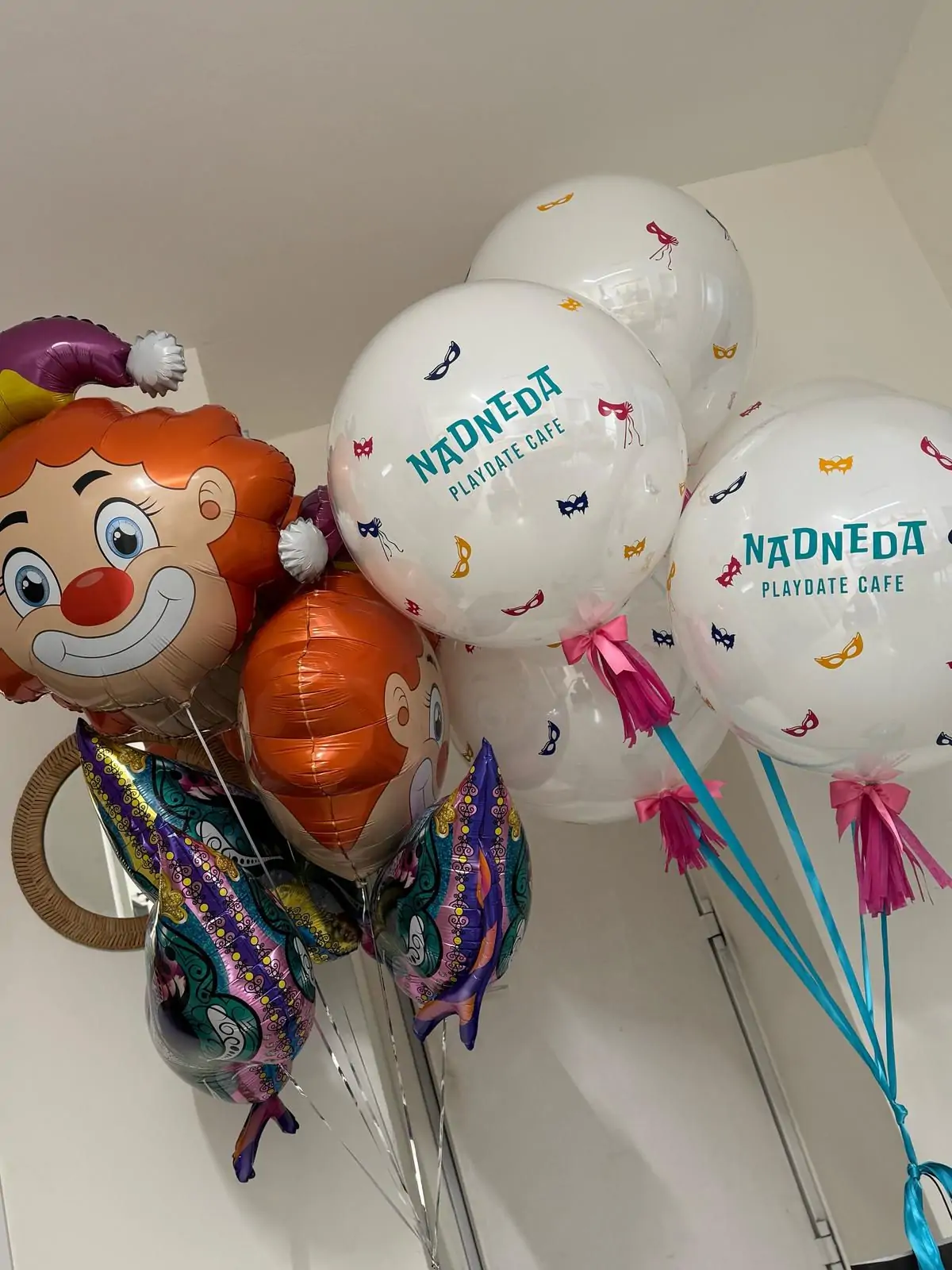 בלוני הליום עם הדפסי מסכות וסידור ממותג, מושלם לקישוט חללים ולהשלמת אווירת פורים שמחה וצבעונית.