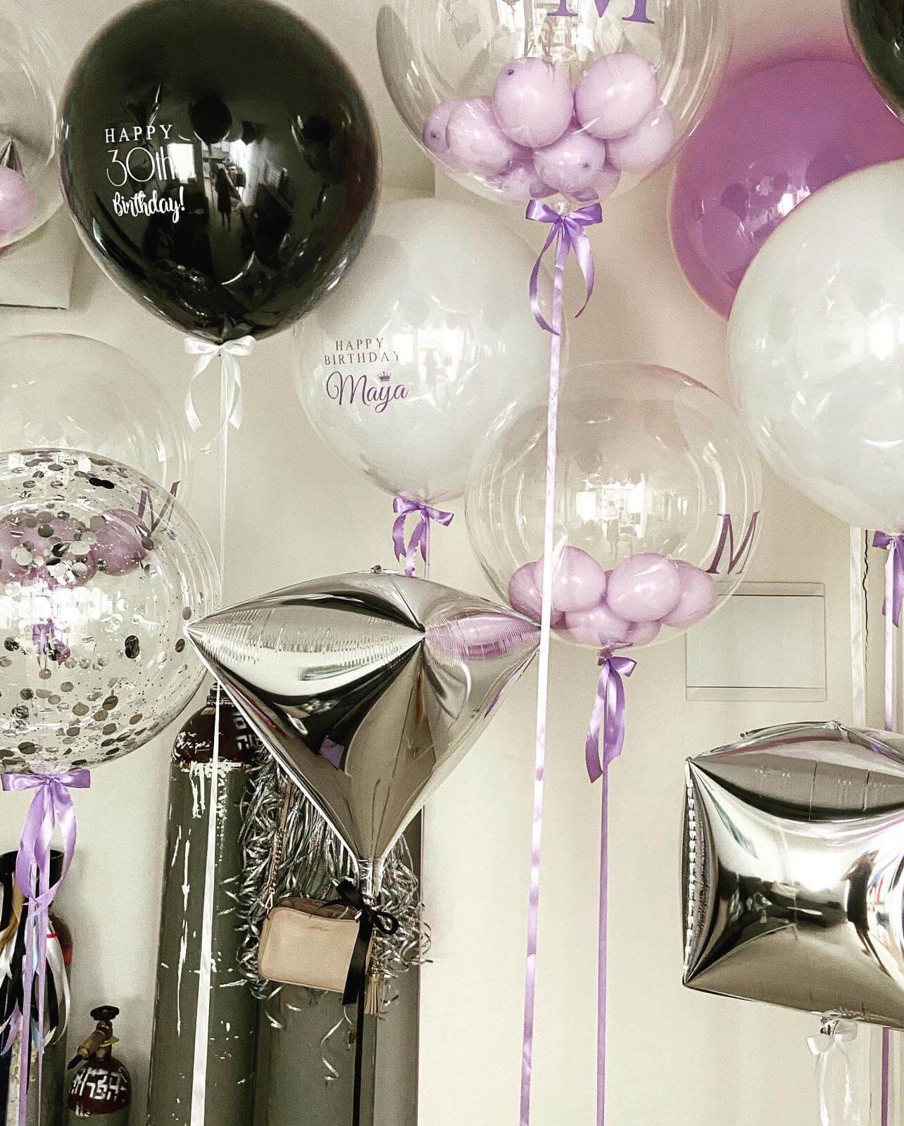 זרי בלונים מעוצבים בתקרה ליום הולדת 30 בסגנון יוקרתי ומודרני. כולל בלונים שקופים עם בלונים קטנים בפנים, בלוני קונפטי נוצצים, בלונים כסופים בצורת יהלום וכוכב, ובלוני הליום בגווני לבן, שחור ולבנדר עם סרטי סatin סגולים. עיצוב אלגנטי ומלא שיק, מושלם להפתעה מרגשת או למסיבת יום הולדת אלגנטית בבית או בסוויטה.