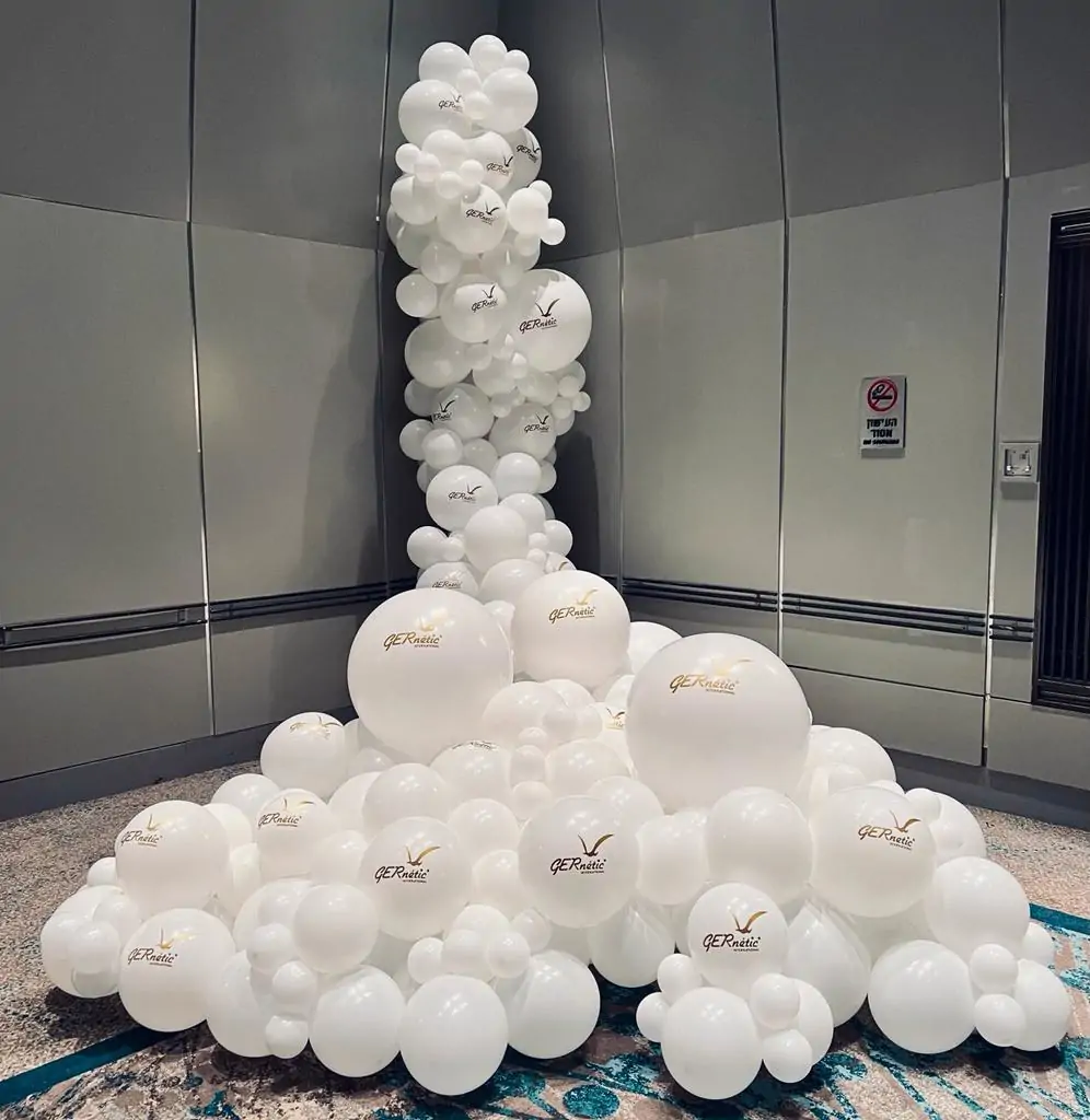 עיצוב בלונים מרשים בסגנון “מפל”, המשלב בלונים לבנים בגדלים משתנים עם מיתוג עדין ליצירת נוכחות חזקה ואלגנטית.