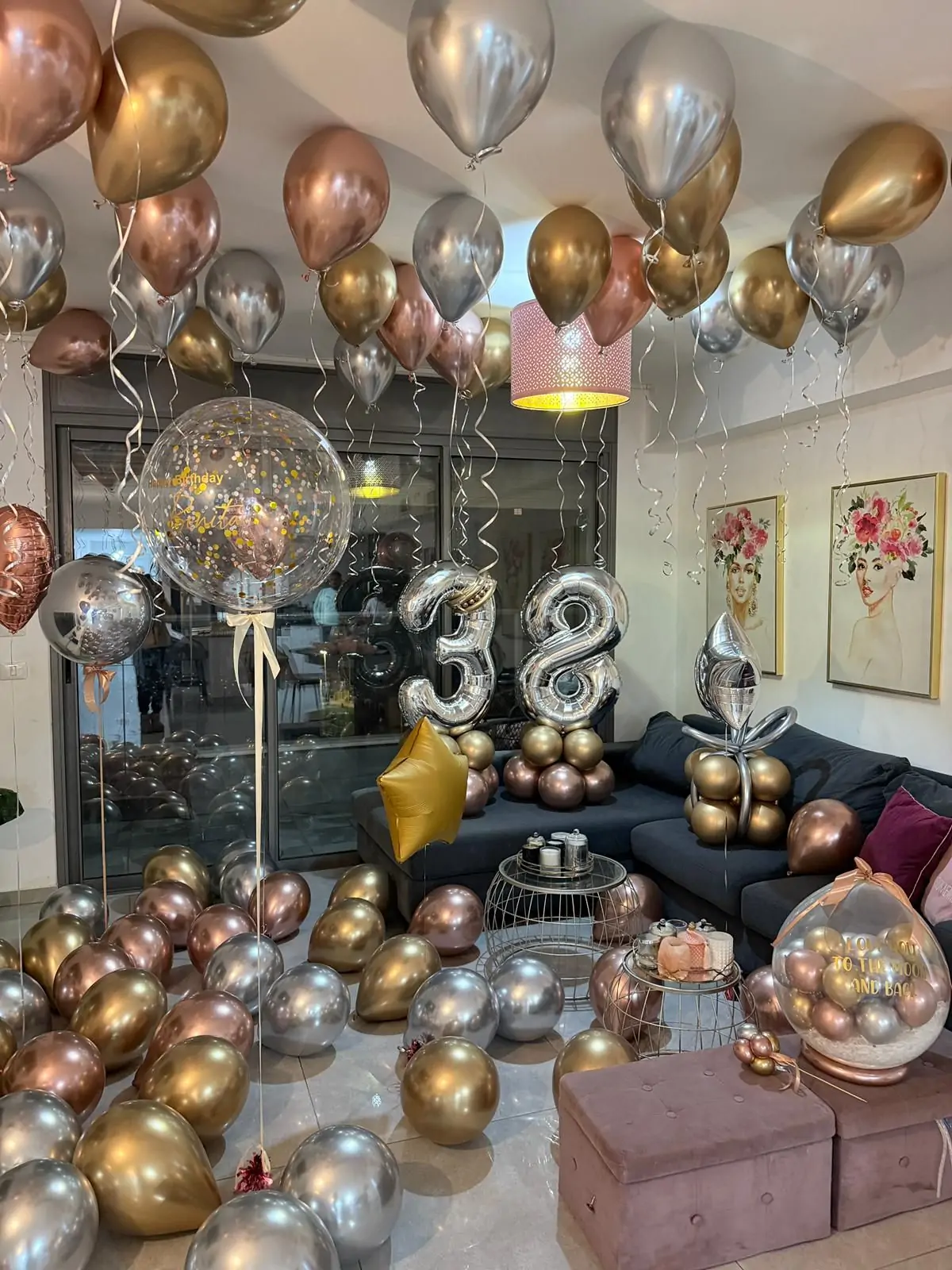 סידור סלון עשיר ומרשים עם בלוני הליום בגווני זהב, כסף ורוז גולד, בשילוב פיזור בלונים על הרצפה ובלונים מרחפים מהתקרה ליצירת תחושת עומק ויוקרה. במרכז החלל ספרות 38 כסופות על בסיס בלונים תואם, לצד בלוני בועה מעוצבים ואלמנטים מטאליים שמוסיפים נוכחות. סידור מושלם ליום הולדת בוגר, אלגנטי ובלתי נשכח בבית.