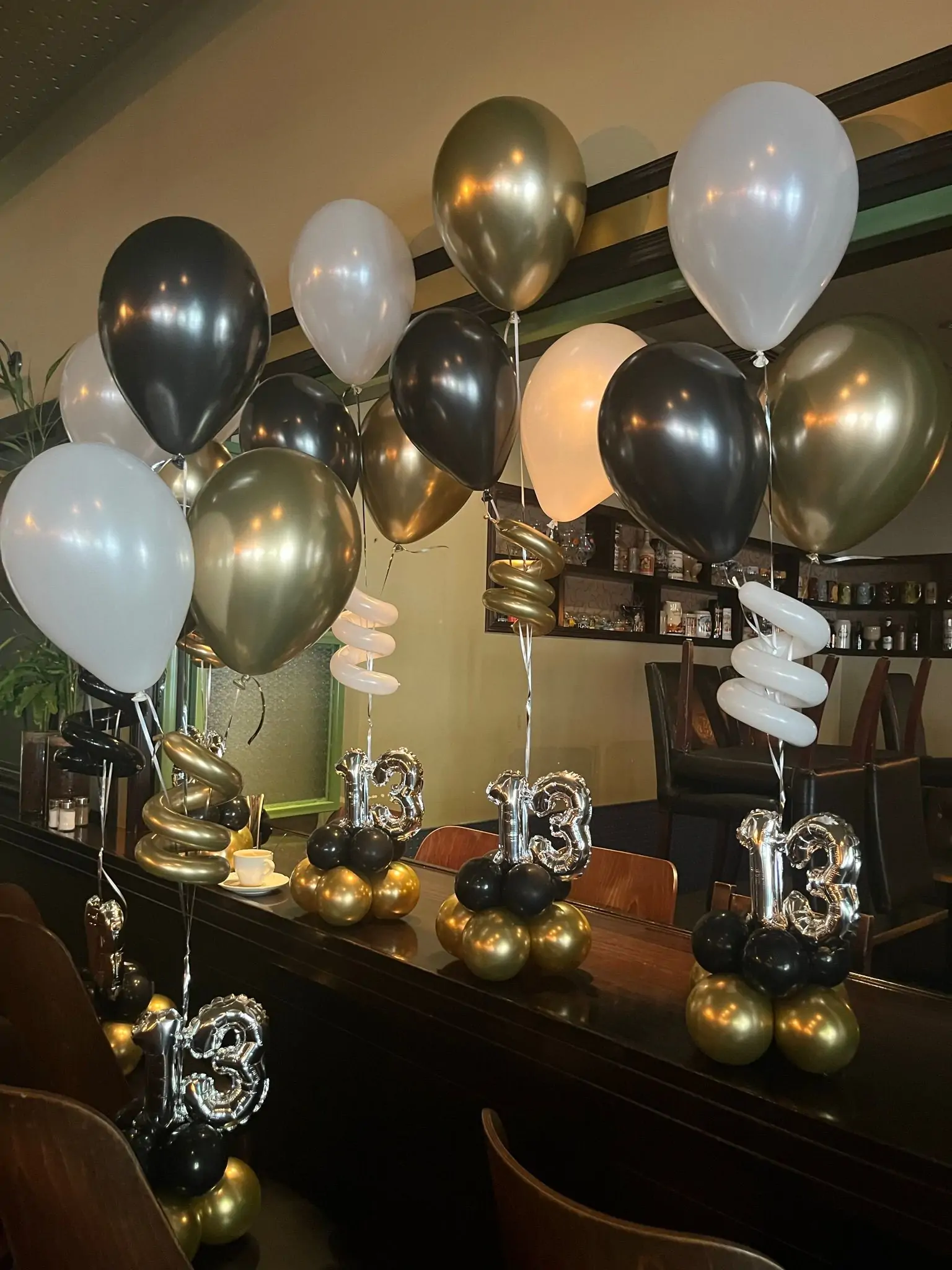 סידור שולחנות לבר מצווה הכולל בלוני הליום בגווני זהב, שחור ולבן, בסיסי בלונים תואמים וספרות כסף לציון הגיל. הסידור יוצר מראה יוקרתי ואחיד לאורך כל חלל האירוע, משתלב מושלם במסעדות, אולמות וחללי אירוח ומוסיף אווירה חגיגית ומרשימה.