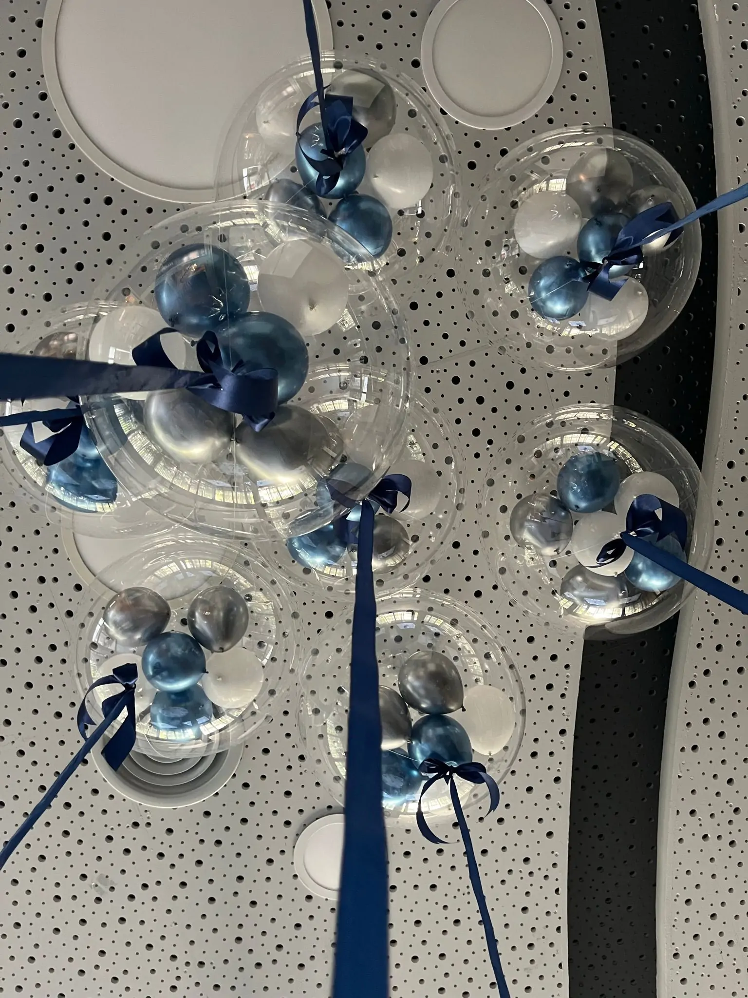 סידור תקרה ייחודי עם בלוני בועה שקופים, בשילוב בלונים פנימיים בגווני כחול, כסף ולבן וסרטי סאטן תואמים. הסידור יוצר מראה מרחף, יוקרתי ומרשים, מושלם לאולמות, בתי כנסת וחללי אירועים, ומוסיף עומק ואווירה חגיגית לכל אירוע בר מצווה.