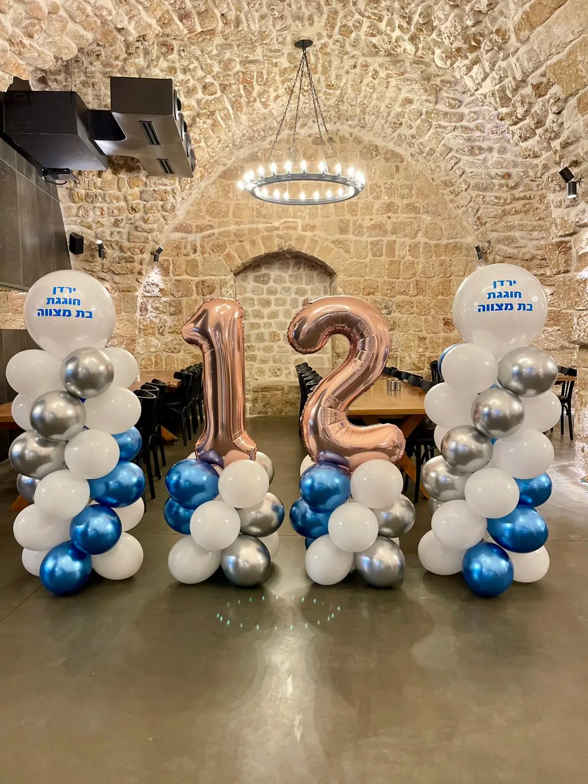 עיצוב בלונים אלגנטי לבת מצווה, עם ספרות גיל 12 בבלוני מיילר בגימור רוז גולד, בשילוב עמודי בלונים בגווני לבן, כסף וכחול. העיצוב משלב מראה חגיגי ומכובד עם נגיעות יוקרה, ומתאים במיוחד לאירוע בת מצווה באולם או בלוקיישן מעוצב, עם דגש על נראות מרשימה וצילומים מושלמים.