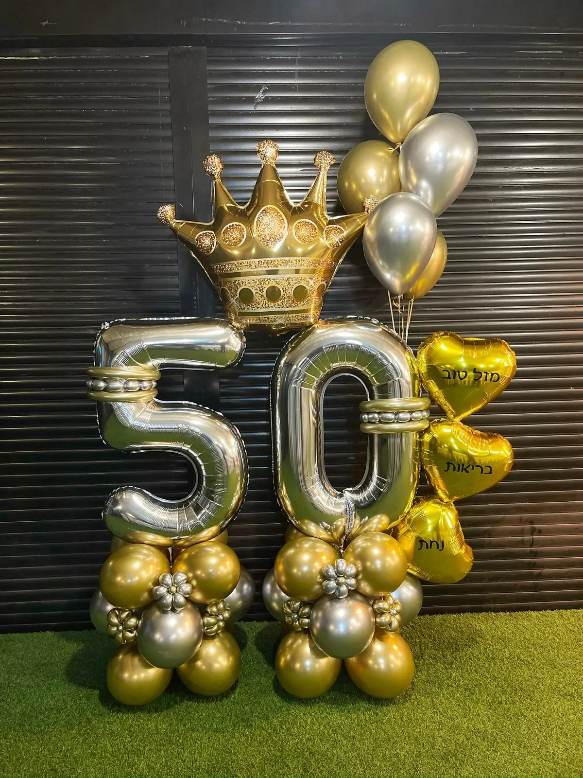 סטנד בלונים יוקרתי בצבעי זהב וכסף עם ספרות 50, כתר מרשים ובלוני לב עם כיתוב – מושלם לחגיגה אלגנטית ובלתי נשכחת.