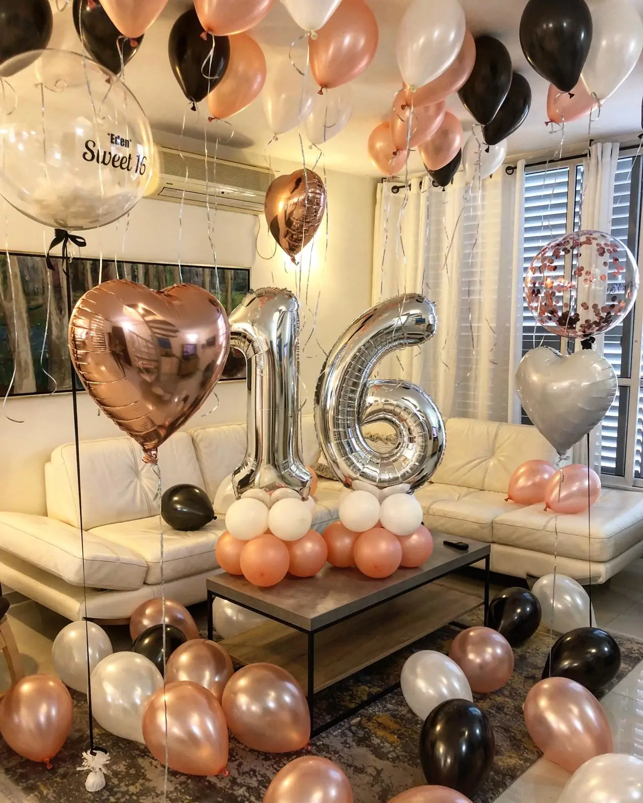 עיצוב יום הולדת מרגש וחגיגי לגיל 16 בגווני רוז גולד לבן ושחור שיוצר שילוב מדויק בין יוקרה לנעורים. במרכז החלל מוצבים בלוני מספרים גדולים שמודגשים על בסיס בלונים תואם ומושכים מיד את העין. סביבם מרחפים בלוני לב מטאליים ובלוני בועה שקופים עם קונפטי וכיתוב Sweet 16 שמוסיפים נוכחות אישית וסטייל. תקרת החדר מלאה בבלוני הליום בגבהים שונים שיוצרים תחושת שפע ועוטפים את החלל באווירה חגיגית. בלונים מפוזרים על הרצפה משלימים את המראה ויוצרים חלל חמים מזמין ומושלם לצילומים ולחגיגה בלתי נשכחת של גיל 16.