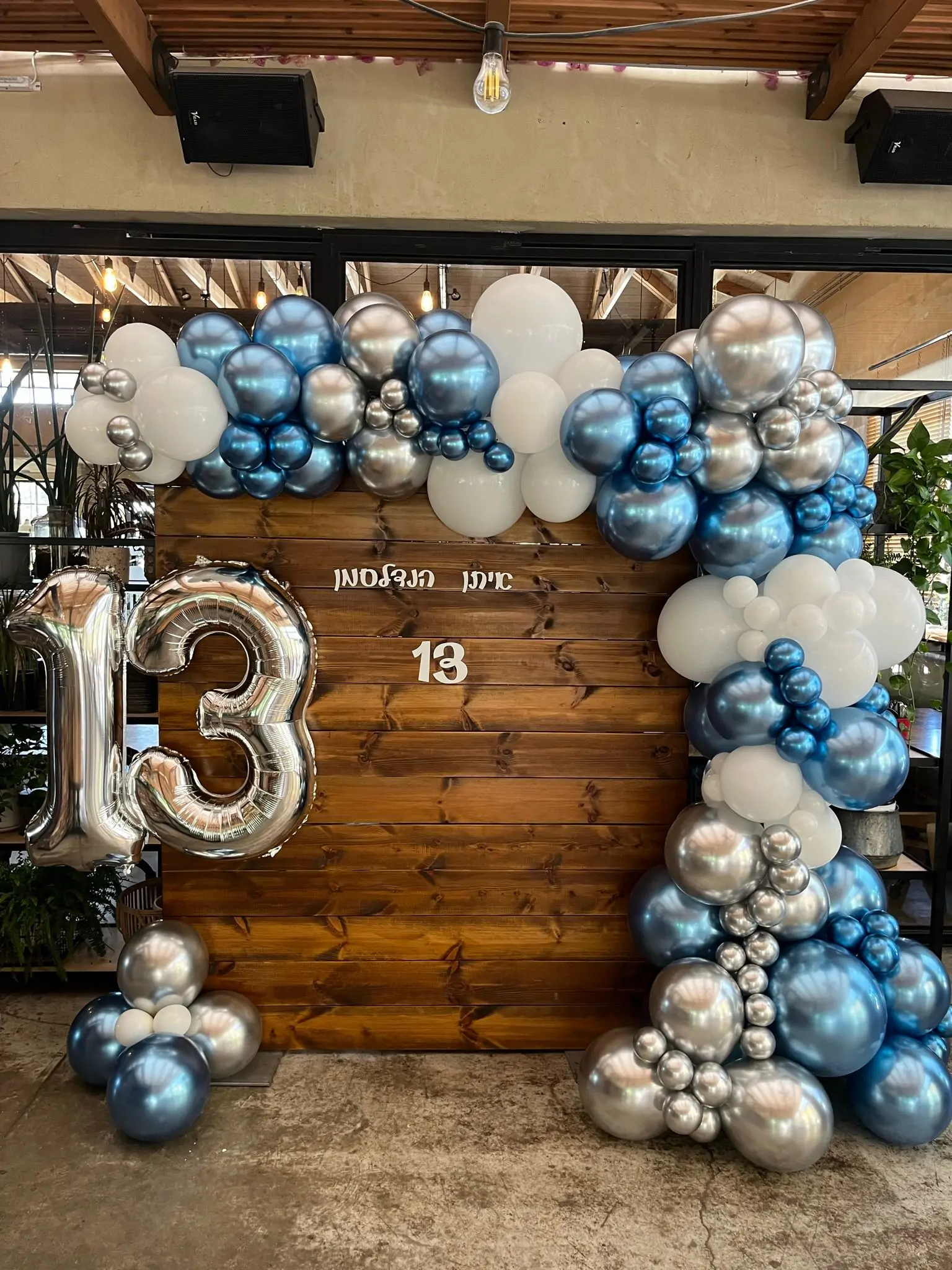 קשת בלונים מרשימה בגווני כחול, כסף ולבן, בשילוב בלון ספרה 13 וכיתוב מותאם אישית על רקע עץ חמים.