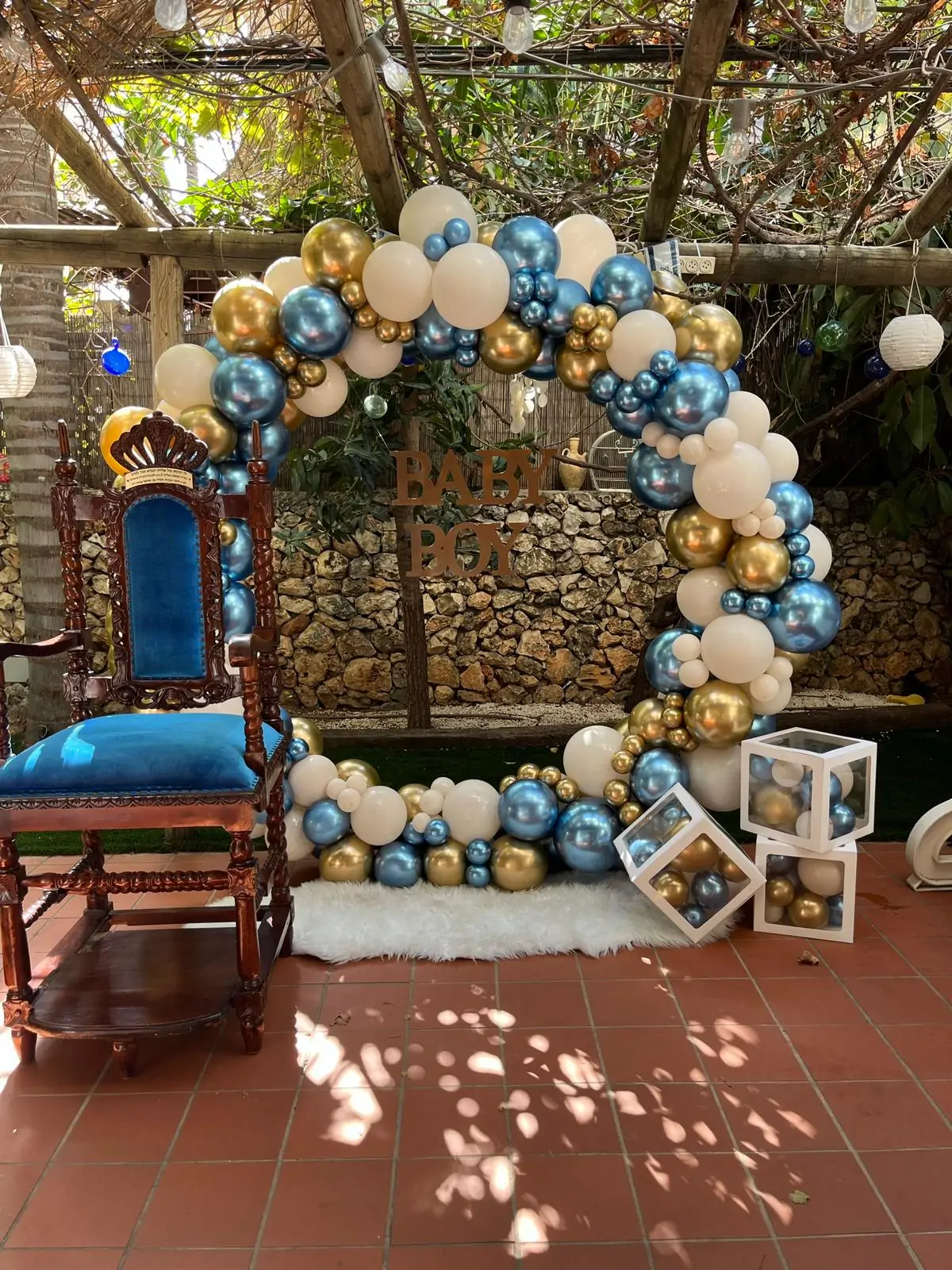 קשת בלונים עגולה ומרשימה לברית, בשילוב בלונים בגווני כחול, זהב ולבן, עם כיתוב “Baby Boy” ואלמנטים משלימים ליצירת מראה יוקרתי וחגיגי. מתאימה כרקע לצילומים, עמדת טקס או מוקד מרכזי באירוע, ומשתלבת מושלם גם בחללים פתוחים וגם באולמות.
