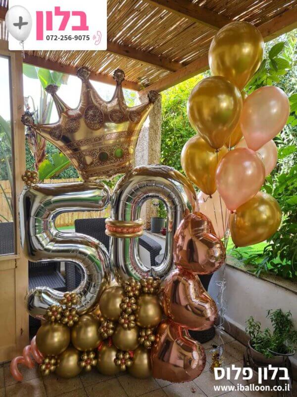 עיצוב בלונים יוקרתי ליום הולדת 50 בגווני זהב, רוז גולד וכסף. כולל בלוני ספרות גדולות “50”, בלון כתר מרשים בחלק העליון, בלוני לב נוצצים ובלוני כרום מעוצבים בבסיס. העיצוב משדר יוקרה, חגיגיות וסטייל – מושלם לחגיגה אלגנטית בבית, בגינה או באולם אירועים.