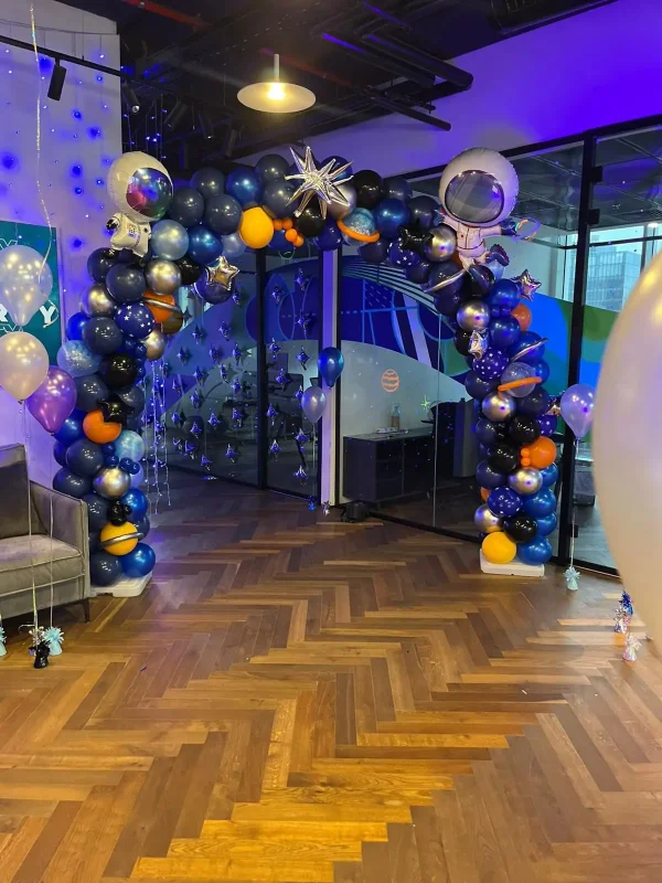 קשת בלונים מרשימה בצבעים עמוקים ובאלמנטים משלימים, מושלמת לכניסה, רחבה או אזור צילום ויוצרת אווירת פורים חגיגית עם נוכחות חזקה.