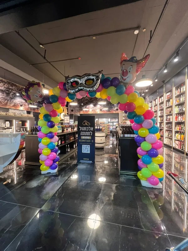 קשת בלונים מרשימה לפורים המעוצבת מבלונים עגולים בגוונים ססגוניים של ורוד, צהוב, ירוק, טורקיז, סגול וכחול. הקשת משלבת אלמנטים ייחודיים של מסכת פורים וראשי ליצן הממוקמים בחלקה העליון, ויוצרים מראה שמח, תיאטרלי ומזמין. העיצוב מתאים במיוחד לקישוט כניסות לחנויות, מתחמי קניות, מסעדות, אירועי פורים ועסקים המעוניינים למשוך תשומת לב וליצור חוויית חג צבעונית ובלתי נשכחת כבר בכניסה.