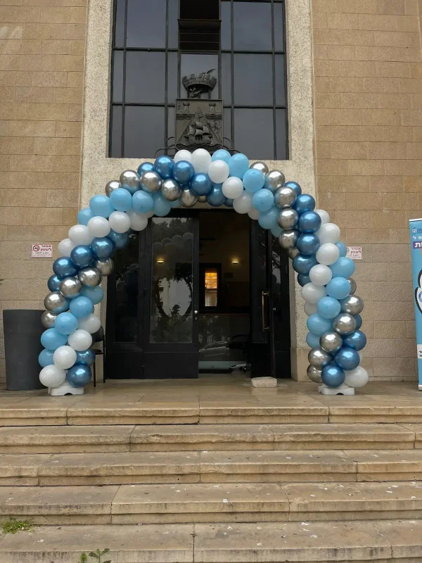 קשת בלונים גדולה ומרשימה לכניסה למבנה ציבורי או לאירוע, בשילוב צבעי כחול, לבן וכסף. מתאימה לאירועים רשמיים, חנוכות, פתיחות חגיגיות ומוסדות, ומעניקה מראה מכובד ובולט כבר מהכניסה.