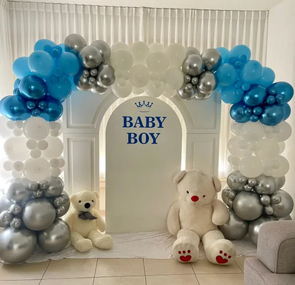 עיצוב בלונים לברית – Baby Boy בכחול, לבן וכסף
