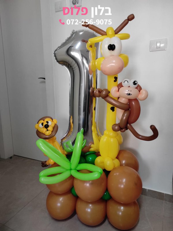 עיצוב בלונים מקסים ליום הולדת 1 בנושא ספארי. כולל בלון ספרה גדולה “1” כסופה, דמויות בלונים בעבודת יד של ג’ירפה, קוף ואריה, עם בסיס בלונים בגווני חום וירוק המדמים את הג’ונגל. עיצוב צבעוני, שמח ומלא חיים – מושלם לימי הולדת ראשונים או מסיבות נושא חיות.
