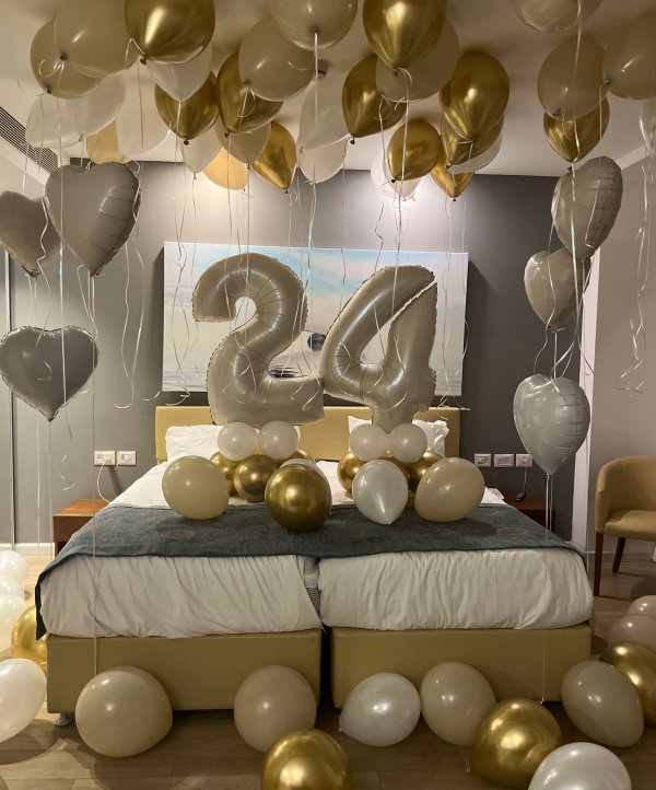 עיצוב בלונים יוקרתי ליום הולדת 24 בגווני לבן וזהב. כולל בלוני הליום בתקרה, בלוני לב כסף, בלוני ספרות גדולות “24” ובסיס בלונים אלגנטי סביב המיטה. שילוב הצבעים היוקרתי יוצר אווירה חגיגית, רומנטית ומרשימה – מושלם כהפתעה בחדר בבית או בסוויטה.