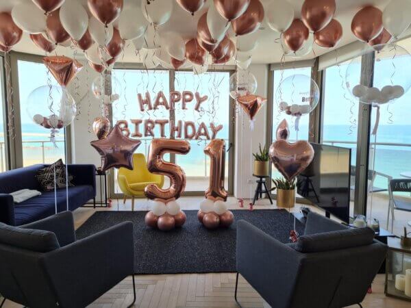 עיצוב יום הולדת 51 יוקרתי עם נוף לים, בגווני רוז גולד, לבן ונחושת. במרכז החדר בלוני ספרות גדולים “51” וכיתוב “HAPPY BIRTHDAY”, סביבם בלוני לבבות וכוכבים, ובלוני הליום מרחפים בתקרה. האווירה חגיגית, אלגנטית ומלאת סטייל – מושלמת לחגיגה באווירה יוקרתית.