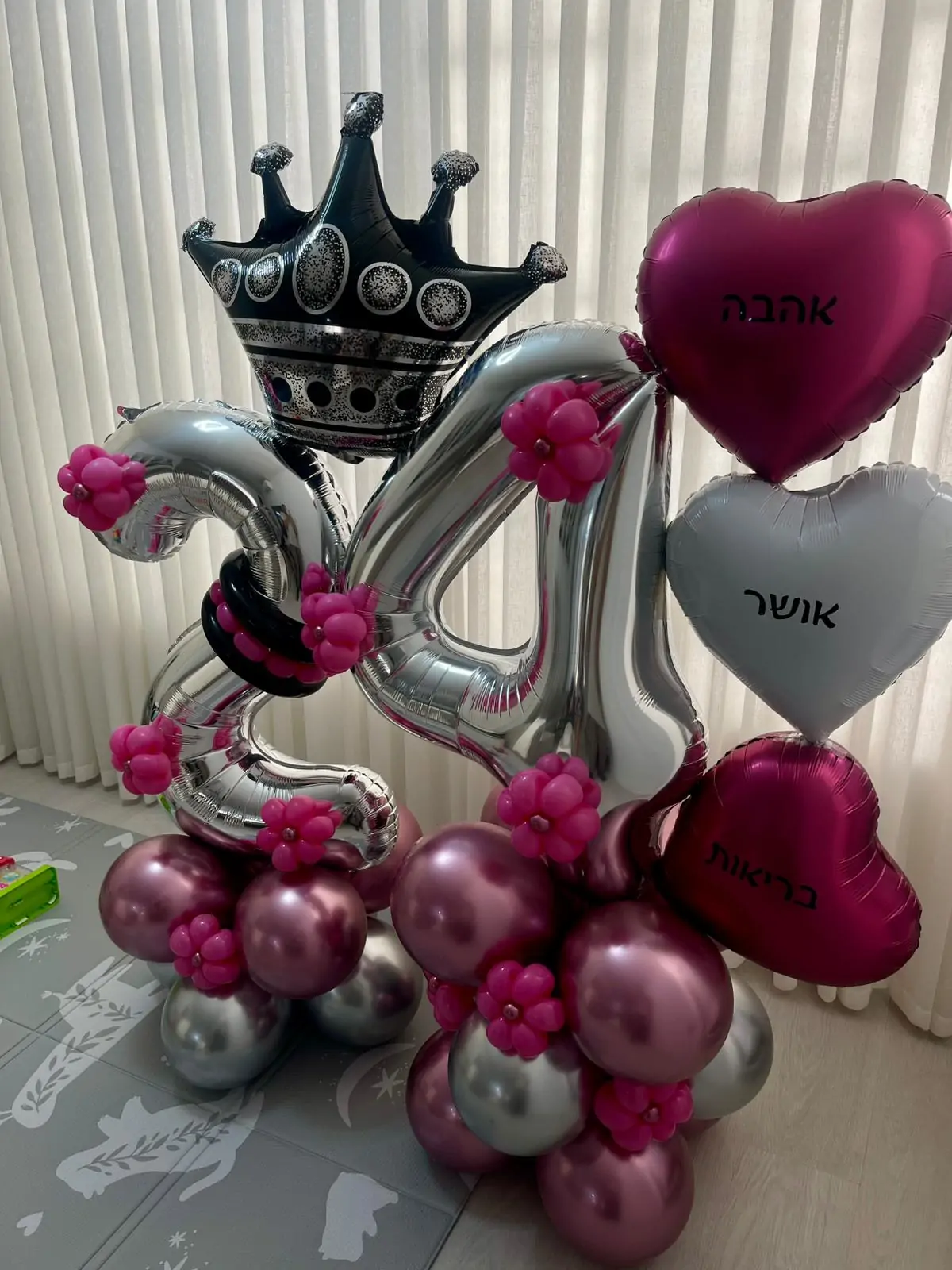 עיצוב אלגנטי בגווני כסף ורוז, כולל ספרות 24 עם כתר, לבבות עם כיתוב אישי ואלמנטים פרחוניים למראה חגיגי ומרשים.