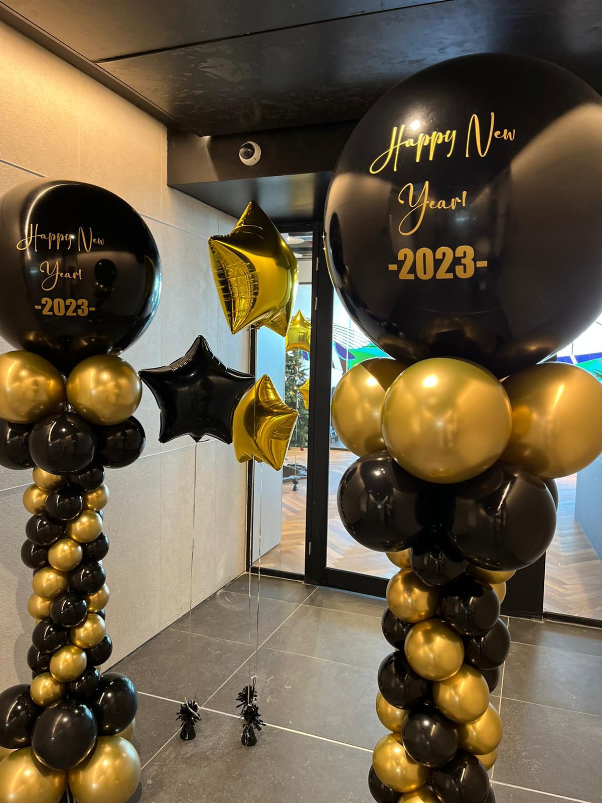 עיצוב בלונים יוקרתי של בלון פלוס לחגיגת סילבסטר ותחילת השנה החדשה 2023. הסט כולל עמודי בלונים מרהיבים בשחור וזהב עם כיתוב “Happy New Year”, לצד בלוני כוכבים מטאליים. שילוב הצבעים והגימור המבריק יוצר מראה אלגנטי ומרשים – מושלם לאירועי חברה, מסיבות סילבסטר וחגיגות סוף שנה נוצצות.