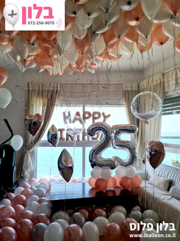 עיצוב בלונים יוקרתי ליום הולדת 25 בגווני רוז גולד, כסף ולבן. כולל מאות בלוני הליום בתקרה, בלוני רצפה תואמים, בלוני ספרות גדולות “25” ובלוני אותיות HAPPY BIRTHDAY. העיצוב משלב בלוני לב וכוכב מטאליים ובלונים שקופים עם קונפטי, ליצירת אווירה חגיגית, רומנטית ומלאת סטייל – מושלם להפתעה בבית או בחדר מלון.