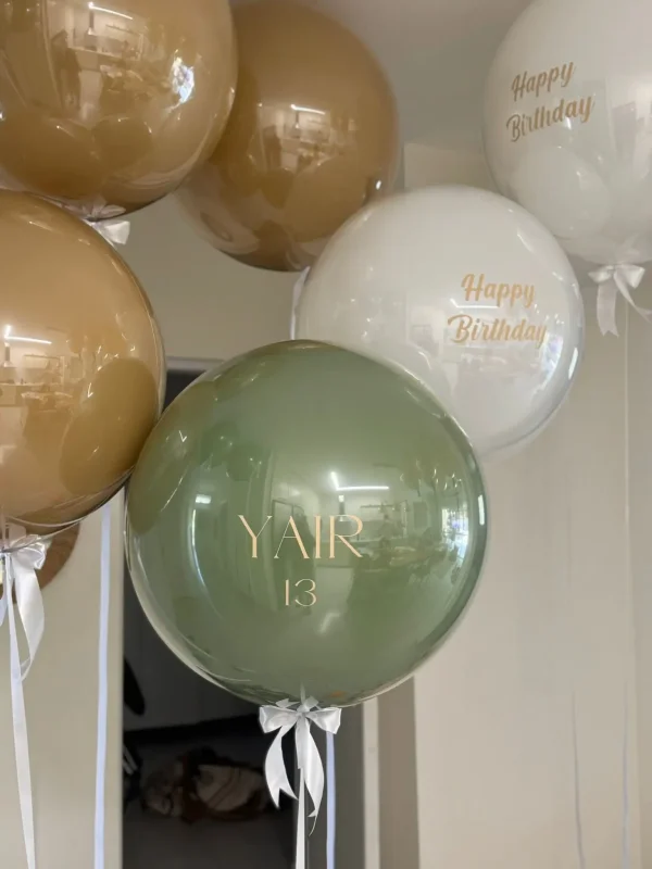 עיצוב בלוני הליום אלגנטי בגווני ירוק זית, שמנת וחום זהוב, עם הדפס זהב יוקרתי של שם החוגג והגיל.