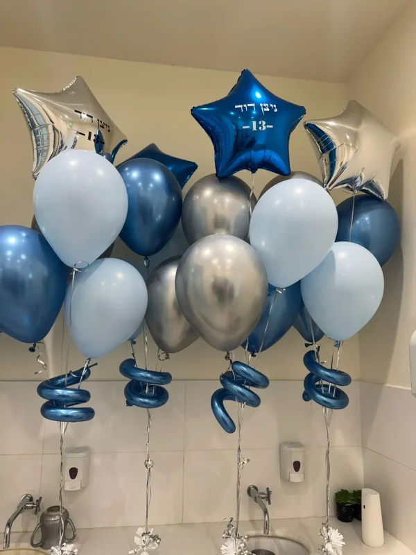 סט בלוני הליום מרשים לבר מצווה בשילוב בלונים בגווני כחול, כסף ולבן, כולל בלוני כוכב עם כיתוב בהתאמה אישית וסלילי בלונים תואמים. מתאים לסידור חלל האירוע, להצבה מעל שולחנות או כאלמנט מרכזי שמוסיף גובה, צבע ואווירה חגיגית ומכובדת.