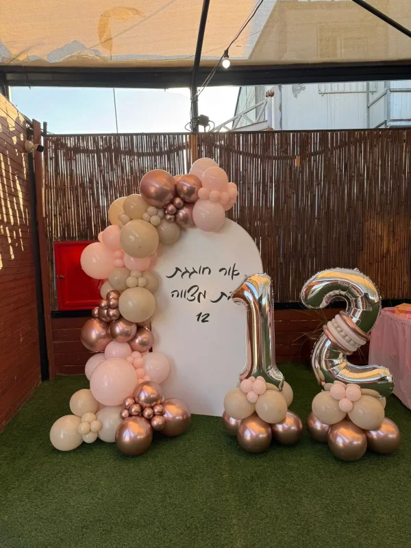 עיצוב בלונים אלגנטי ומרשים לבת מצווה, בשילוב קשת בלונים עשירה בגווני ניוד, שמנת ורוז גולד, לוח מעוצב עם כיתוב אישי ובלוני ספרות כסופים המציגים את גיל 12. העיצוב משדר יוקרה, עדינות וסטייל מודרני, ומתאים במיוחד לבת מצווה, חגיגות משפחתיות, אירועי חוץ ופינות צילום מעוצבות עם טאץ’ יוקרתי וייחודי.