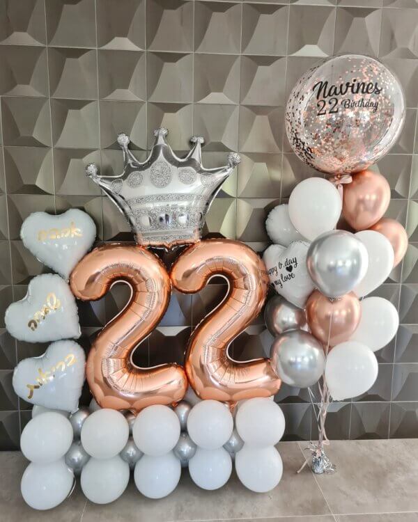 עיצוב בלונים יוקרתי ליום הולדת 22 בגווני רוז גולד, כסף ולבן. כולל בלוני ספרות גדולות “22”, בלון כתר כסוף מרשים, בלוני לב עם הקדשות אישיות ובלון שקוף עם קונפטי נוצץ. עיצוב אלגנטי, צעיר ומלא סטייל – מושלם להפתעת יום הולדת בחדר, בית או סוויטה יוקרתית.