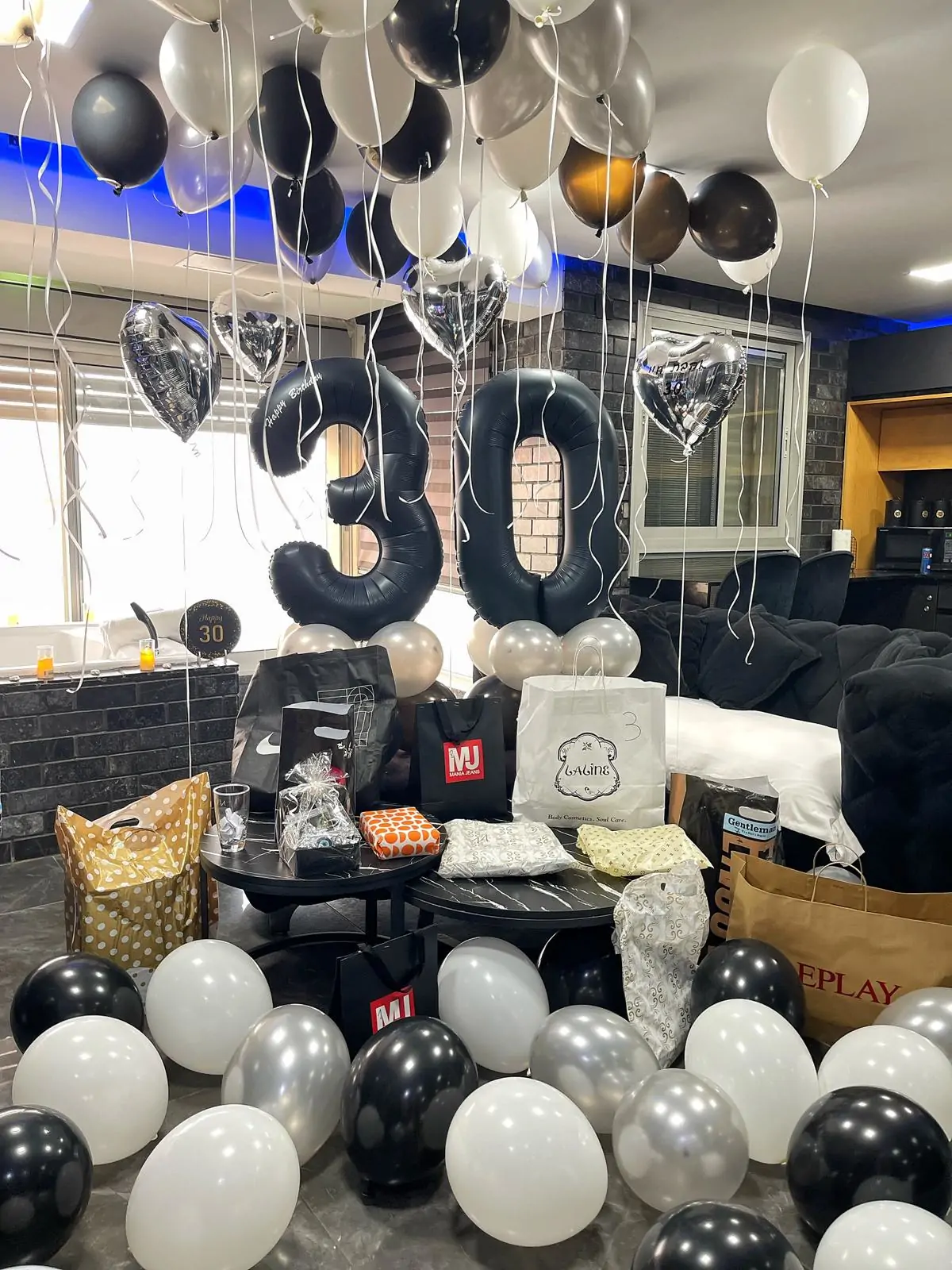 עיצוב חגיגי ומרשים בגווני שחור, לבן וכסף, כולל ספרות ענק 30, בלוני הליום ולבבות – מושלם לחגיגת יום הולדת עגול בסטייל יוקרתי.