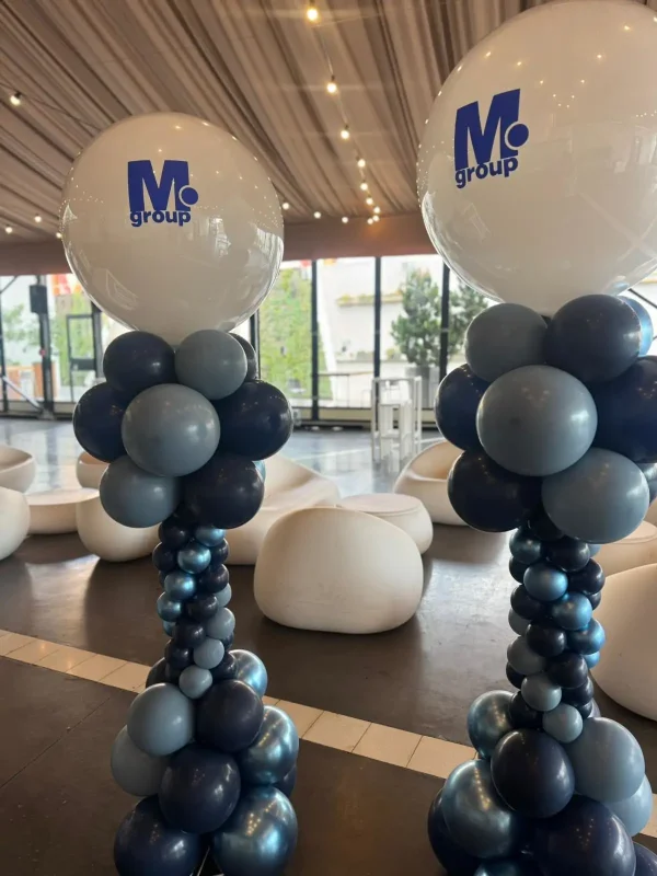 זוג עמודי בלונים אלגנטיים בעיצוב עסקי ומוקפד, המשלבים בלוני ענק לבנים עם מיתוג Mo Group וקומפוזיציית בלונים בגווני כחול וכחול כהה. העמודים יוצרים נוכחות מרשימה ומאוזנת בחלל, ומשתלבים בצורה טבעית באירועי חברה, כנסים, השקות ומפגשי לקוחות. פתרון עיצובי שמשדר יוקרה, סדר ומקצועיות, ומחזק את הנראות והמיתוג של העסק כבר מהרגע הראשון.