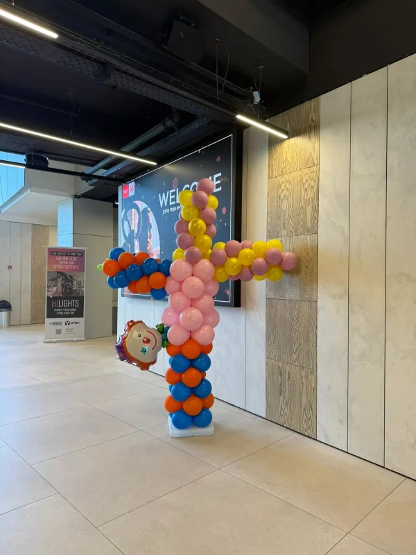 עמוד בלונים ייחודי לפורים בעיצוב ליצן, בנוי בצורת X מרשימה משילוב בלונים עגולים בצבעים חגיגיים של ורוד, צהוב, כחול וכתום. אלמנט הליצן ממוקם בצד העמוד ויוצר מראה שובב, שמח ומפתיע שמושך את העין מכל זווית. העיצוב מתאים במיוחד לקישוט קניונים, מבואות לבניינים, מתחמי משרדים, מרכזים מסחריים ואירועי פורים, ומוסיף נוכחות צבעונית ואווירת חג ייחודית לחלל.