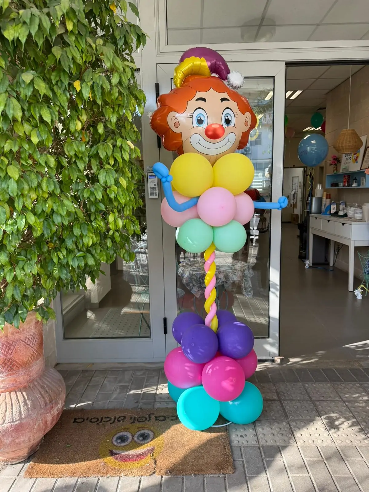עמוד בלונים מעוצב בדמות ליצן מחויך לפורים, עשוי שילוב בלונים בגוונים רכים ושמחים של צהוב, ורוד, מנטה, סגול וטורקיז. הליצן ממוקם בראש העמוד עם כובע פורים חגיגי וידיים פתוחות, ויוצר מראה מזמין ושמח במיוחד. העיצוב אידיאלי לקישוט כניסות לעסקים, גני ילדים, מסגרות חינוכיות, חנויות ואירועי פורים, ומכניס אווירת חג צבעונית כבר בכניסה למקום.