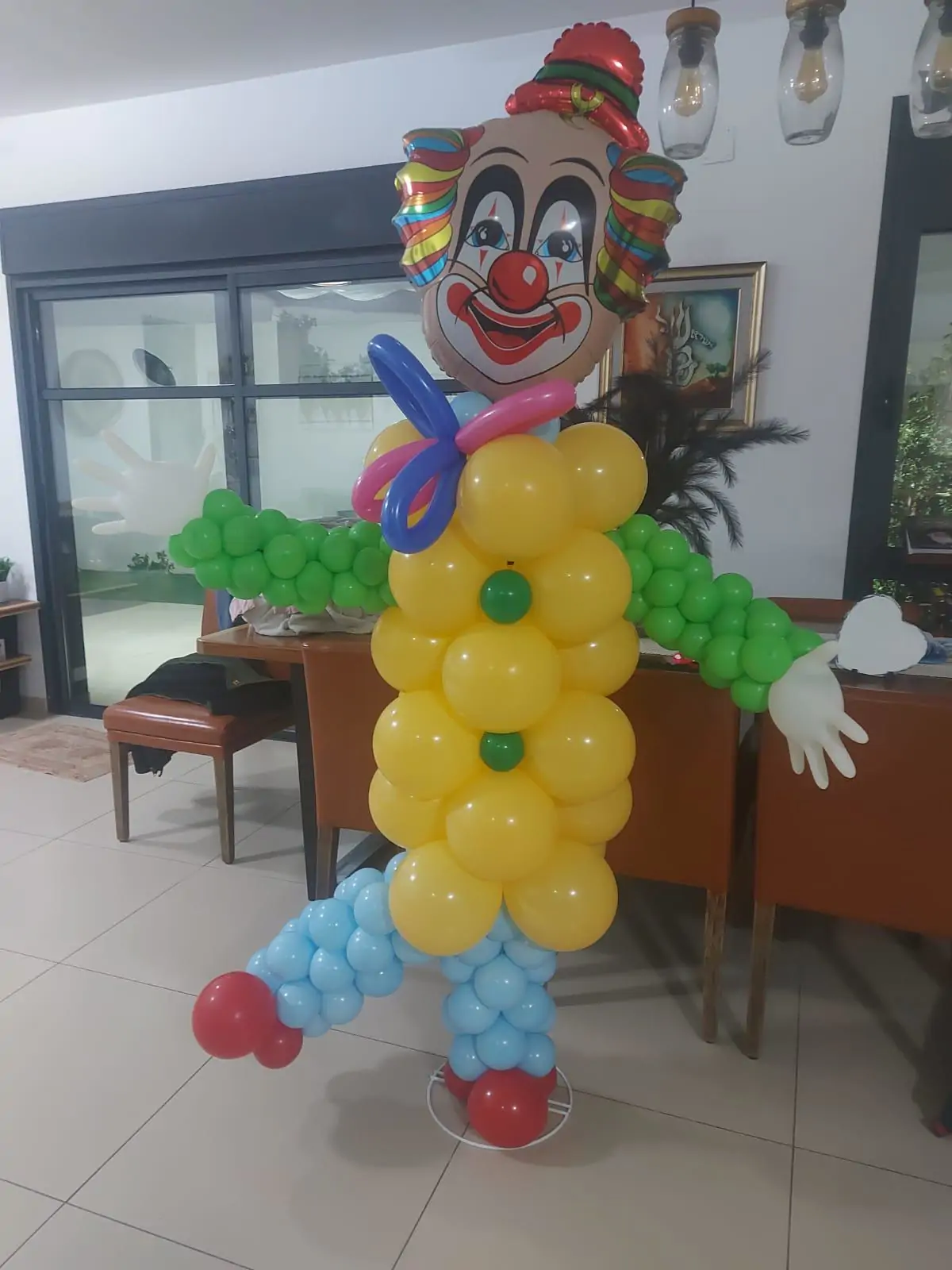 סידור בלונים מרהיב בצורת דמות ליצן עומדת, המעוצבת מבלונים עגולים בגווני צהוב, ירוק, תכלת, אדום ורוד. הדמות כוללת גוף גבוה ומלא נפח, ידיים פרושות מבלונים, רגליים עשויות בלונים וכובע ליצן צבעוני ליצירת מראה שמח, בולט וחגיגי במיוחד. העיצוב מתאים לאירועי פורים, קישוט חללים פנימיים, מסיבות ילדים, גני ילדים, מתנ"סים וכניסות לאירועים, ומוסיף נוכחות מרשימה ואווירת חג ססגונית.