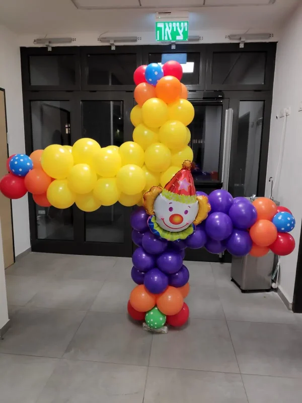 סידור בלונים מרשים בצורת דמות ליצן חגיגית לפורים, המשלב בלונים צבעוניים בגווני צהוב, סגול, כתום, אדום וכחול. הדמות כוללת גוף עשוי בלונים עגולים, ידיים פרושות מבלונים וראש ליצן עם כובע פורים צבעוני, ליצירת מראה שמח, בולט ומלא אנרגיה. העיצוב מתאים לקישוט חללים פנימיים, כניסות לאירועים, מוסדות חינוך, מתנ"סים ואירועי פורים, ומוסיף אווירה חגיגית וססגונית במיוחד.