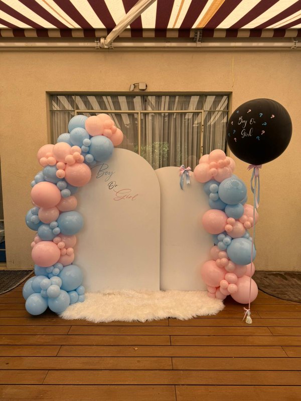 עמדת בלונים מעוצבת לאירוע חשיפת מין התינוק (“Boy or Girl”).