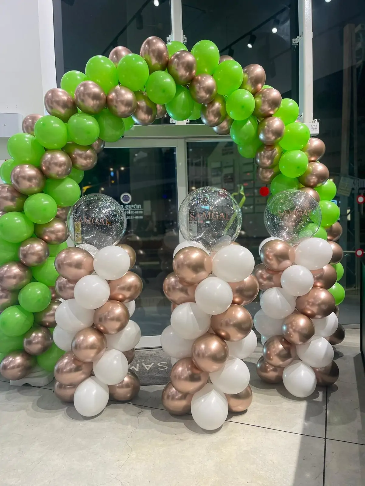 קשת בלונים מרשימה בצבע ירוק בשילוב רוז גולד ולבן, עם עמודי בלונים תואמים ובלוני בועה שקופים. מתאימה להשקת עסק, פתיחה חגיגית, אירועי קד״מ ופינת צילום בכניסה, עם אפשרות להתאמה אישית מלאה.