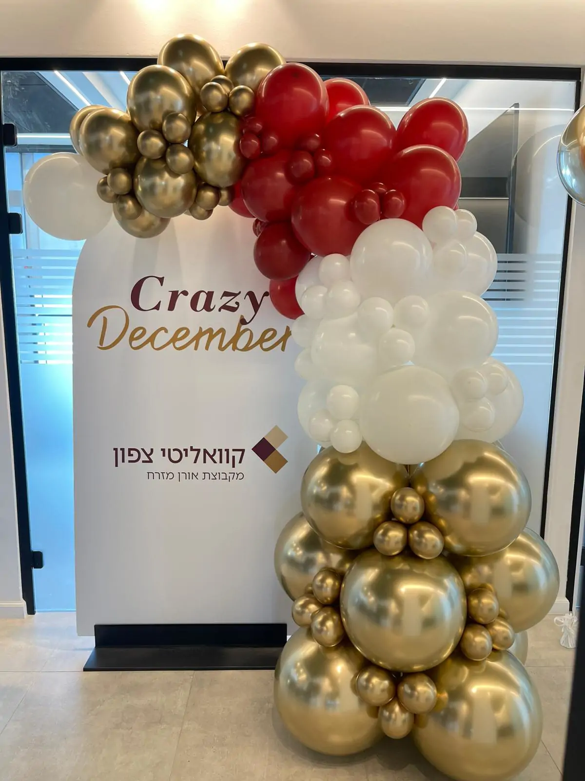 עיצוב בלונים אלגנטי וממותג לאירוע חברה או קבלת פנים, בשילוב צבעי אדום, לבן וזהב סביב קיר מיתוג. מתאים לאירועי עובדים, השקות וימי חג, ומעניק מראה יוקרתי ומרשים עם אפשרות להתאמה אישית מלאה.