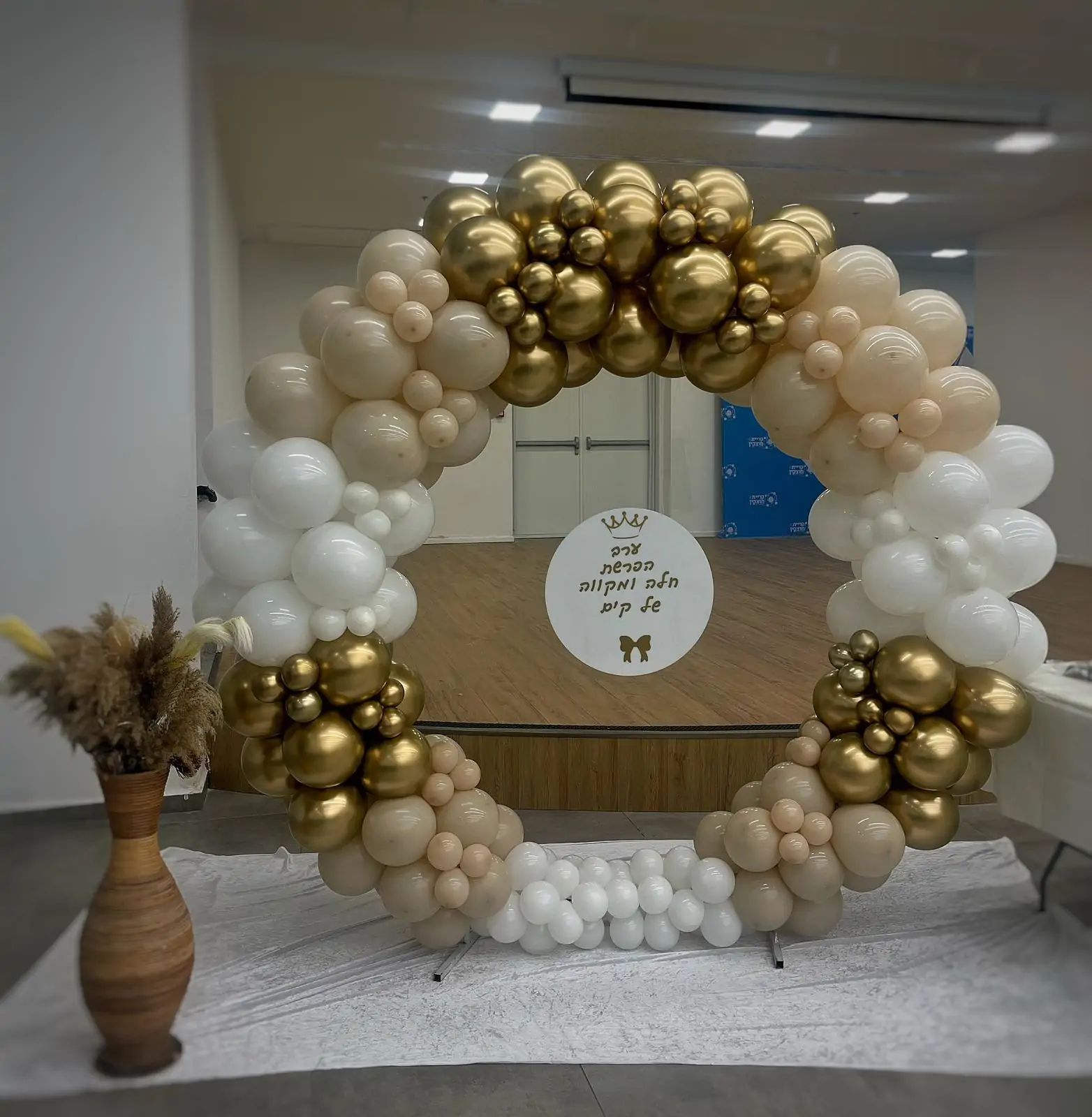 קשת בלונים עגולה ומרשימה בגווני לבן, שמנת וזהב, עם שלט מרכזי ממותג. מתאימה לבריתות, חינות, אירועי בוטיק וצילומים, ומעניקה מראה אלגנטי, נקי ויוקרתי עם אפשרות להתאמה אישית.