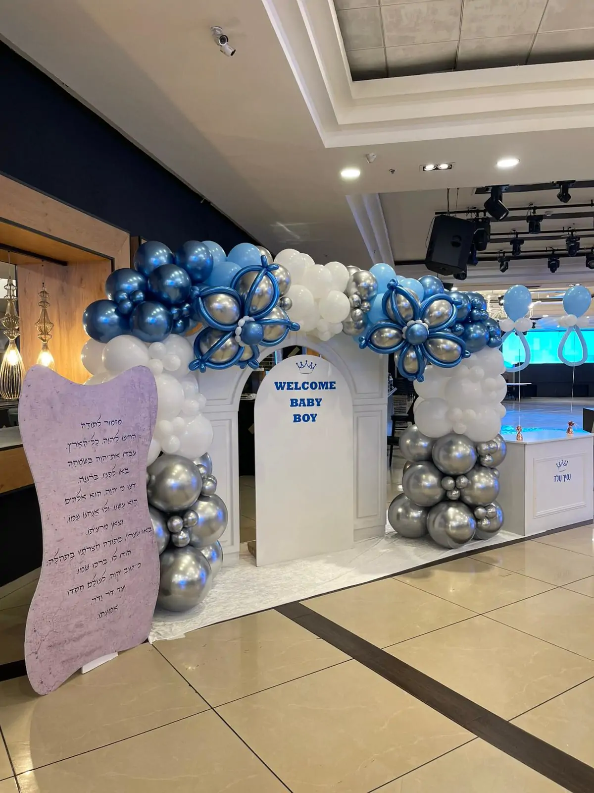 עיצוב בלונים מרשים לברית בשילוב כחול, לבן וכסף, עם קשת מעוצבת, שלט מרכזי ואלמנטים מיוחדים. מתאים לאולמות אירועים ולבתי כנסת, ויוצר אווירה חגיגית, נקייה ויוקרתית.