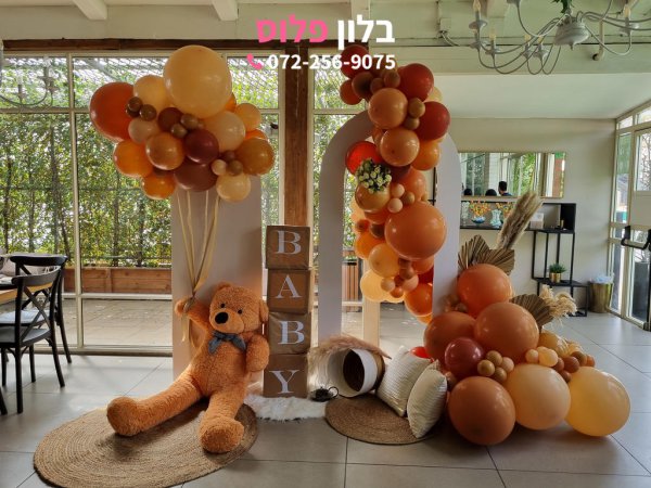עיצוב בלונים חמים ומעוצב של בלון פלוס לתינוק – בגווני חום, כתום וניוד עם שילוב של קשת בלונים, קוביות BABY ודובי ענק. העיצוב יוצר אווירה רכה, טבעית ומזמינה, מושלם לצילומי תינוקות או לחגיגות משפחתיות אינטימיות.