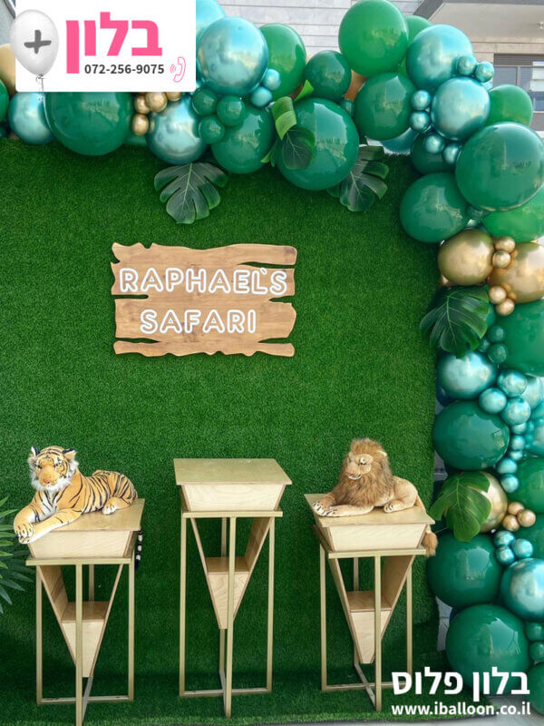 עיצוב בלונים מדהים בסגנון ספארי לג’ונגל. קשת בלונים עשירה בגווני ירוק, זהב וטורקיז בשילוב עלים טרופיים, על רקע דשא מלא חיים. העיצוב כולל עמדות עץ דקורטיביות וחיות ספארי רכות להשלמת האווירה. מושלם לימי הולדת, בריתות או מסיבות נושא – חוויה טבעית, צבעונית ומרשימה במיוחד.
