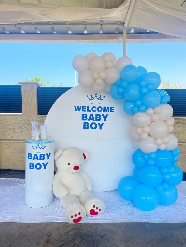 עמדת צילום מעוצבת לברית או בריתה, בשילוב בלונים בכחול ולבן, קיר מיתוג עגול, דובי ענק ואלמנטים משלימים. מתאימה לאירועים בבית או בחוץ, ויוצרת פינה מרגשת, נקייה ומרשימה לצילומים.