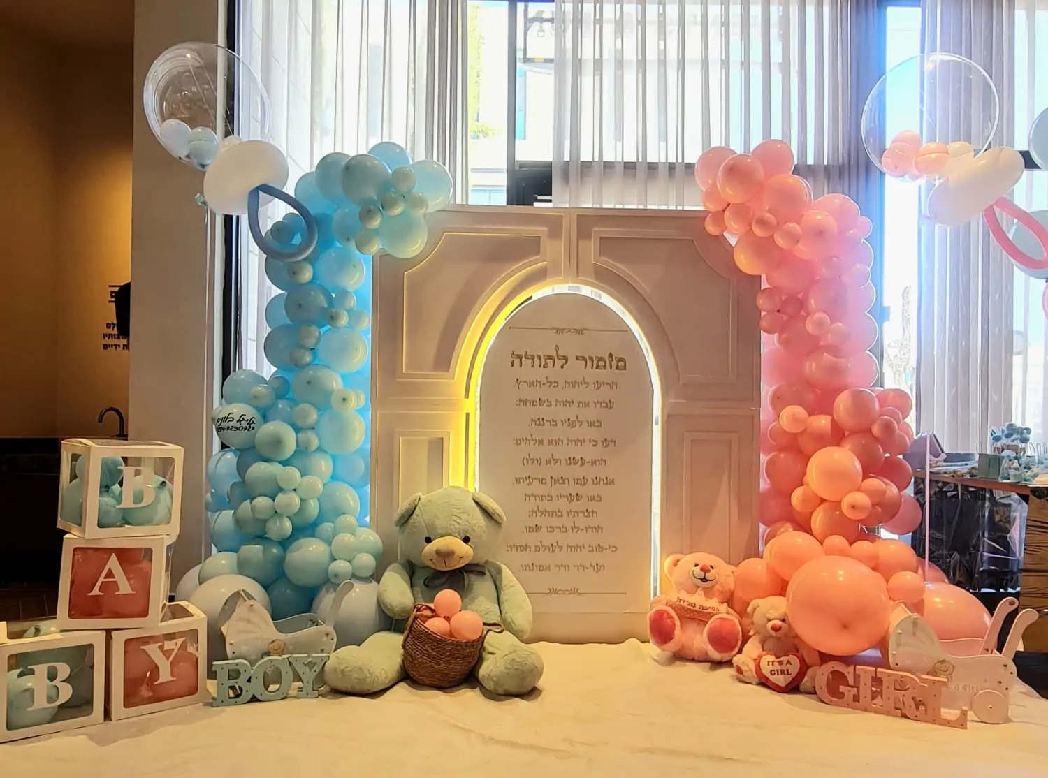 קיר צילום מרשים ומרגש לברית או בריתה, בעיצוב סימטרי ייחודי המשלב שער מעוצב עם תאורה פנימית רכה, בלונים בגווני כחול וורוד משני הצדדים, ואלמנטים משלימים של דובי פרווה, קוביות BABY ובלוני בועה שקופים.