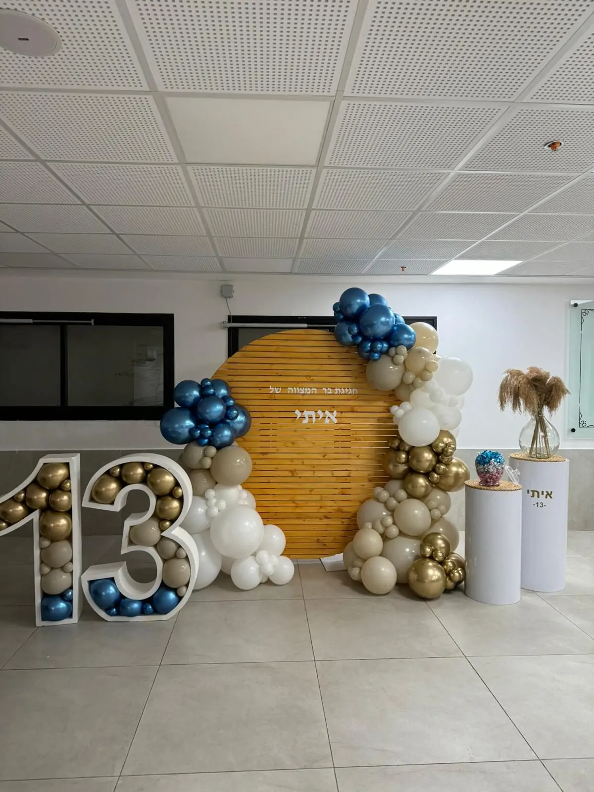העיצוב כולל ספרת 13 גדולה מלאה בלונים, עמודי עיצוב משלימים ומראה אלגנטי וחמים שמתאים במיוחד לאולם, בית כנסת או אירוע משפחתי.