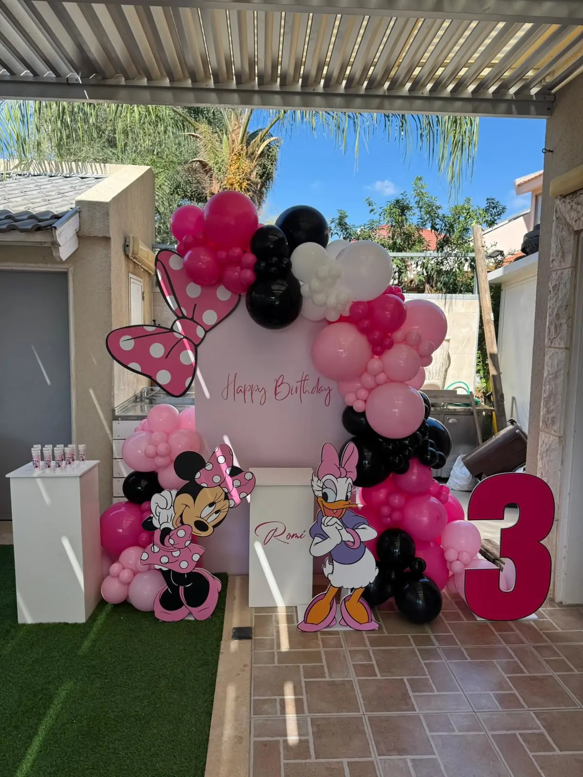 עיצוב יום הולדת מתוק וחגיגי בהשראת מיני מאוס, בשילוב קשת בלונים מרשימה בגווני ורוד, שחור ולבן, אלמנטים מעוצבים של מיני ודייזי, שלט Happy Birthday עם שם הילדה ומספר גיל 3 בולט. העיצוב יוצר פינת צילום צבעונית ומלאת שמחה, ומתאים במיוחד ליום הולדת לבנות, חגיגות גיל 3, מסיבות גן ואירועי ילדים עם קונספט אהוב ומנצח.