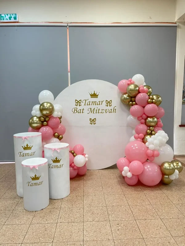 עיצוב בלונים אלגנטי ומוקפד לבת מצווה, בשילוב בלונים בגווני ורוד, לבן וזהב, עם קשת בלונים עשירה ורקע עגול ממותג בהתאמה אישית. העיצוב כולל עמודי דקור תואמים עם שם החוגגת, אלמנטים עדינים ותחושת יוקרה חגיגית – מושלם לצילומים, קבלת פנים ואירוע בת מצווה מרגש ומלא סטייל.