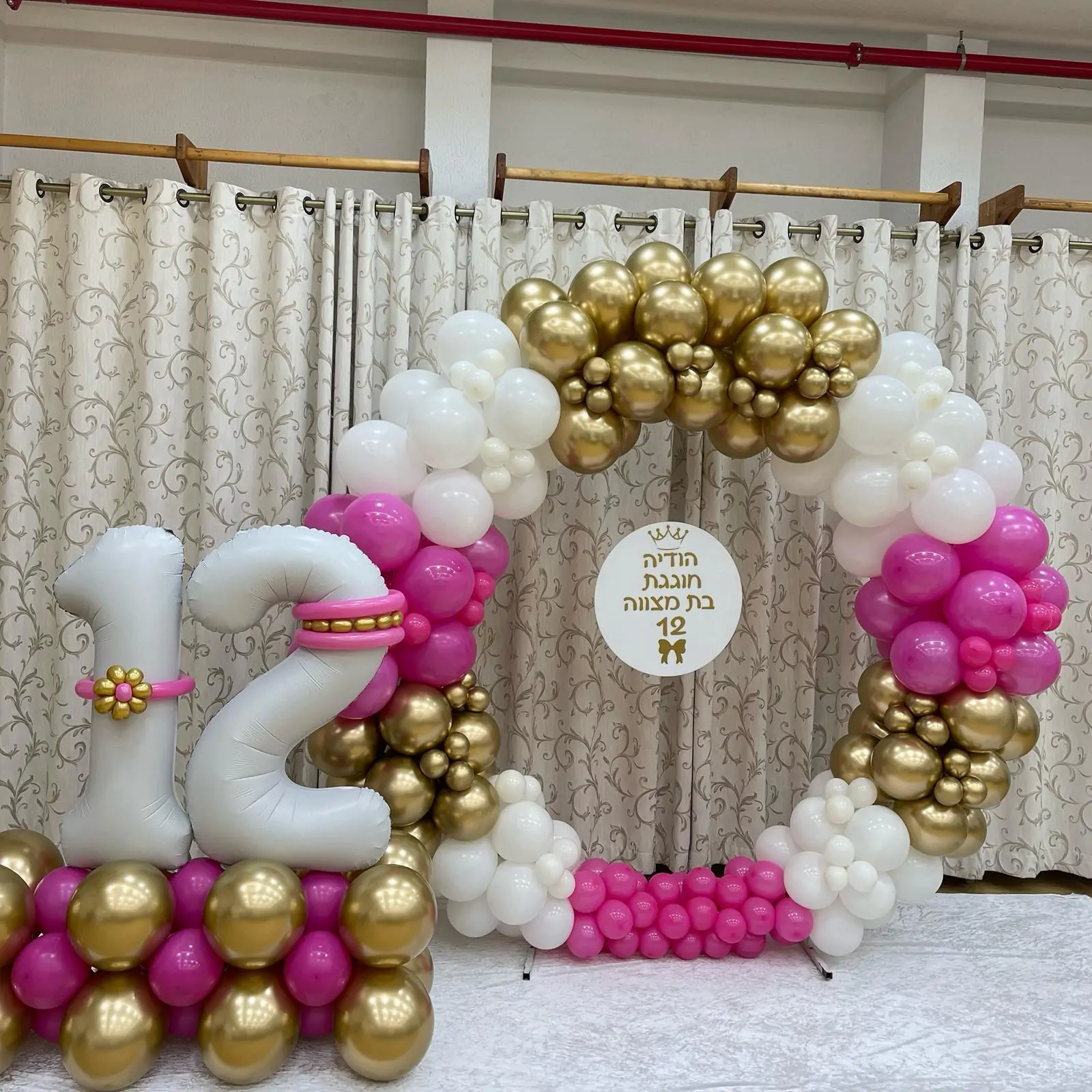 עיצוב בלונים אלגנטי לבת מצווה, הכולל קשת בלונים מרשימה בגווני ורוד, לבן וזהב, עם ספרות “12” מעוצבות ואלמנטים יוקרתיים. שילוב הצבעים והעיצוב המדויק יוצרים פינת צילום חגיגית, מרשימה ומלאת סטייל – מושלם לאירוע בת מצווה בלתי נשכח.