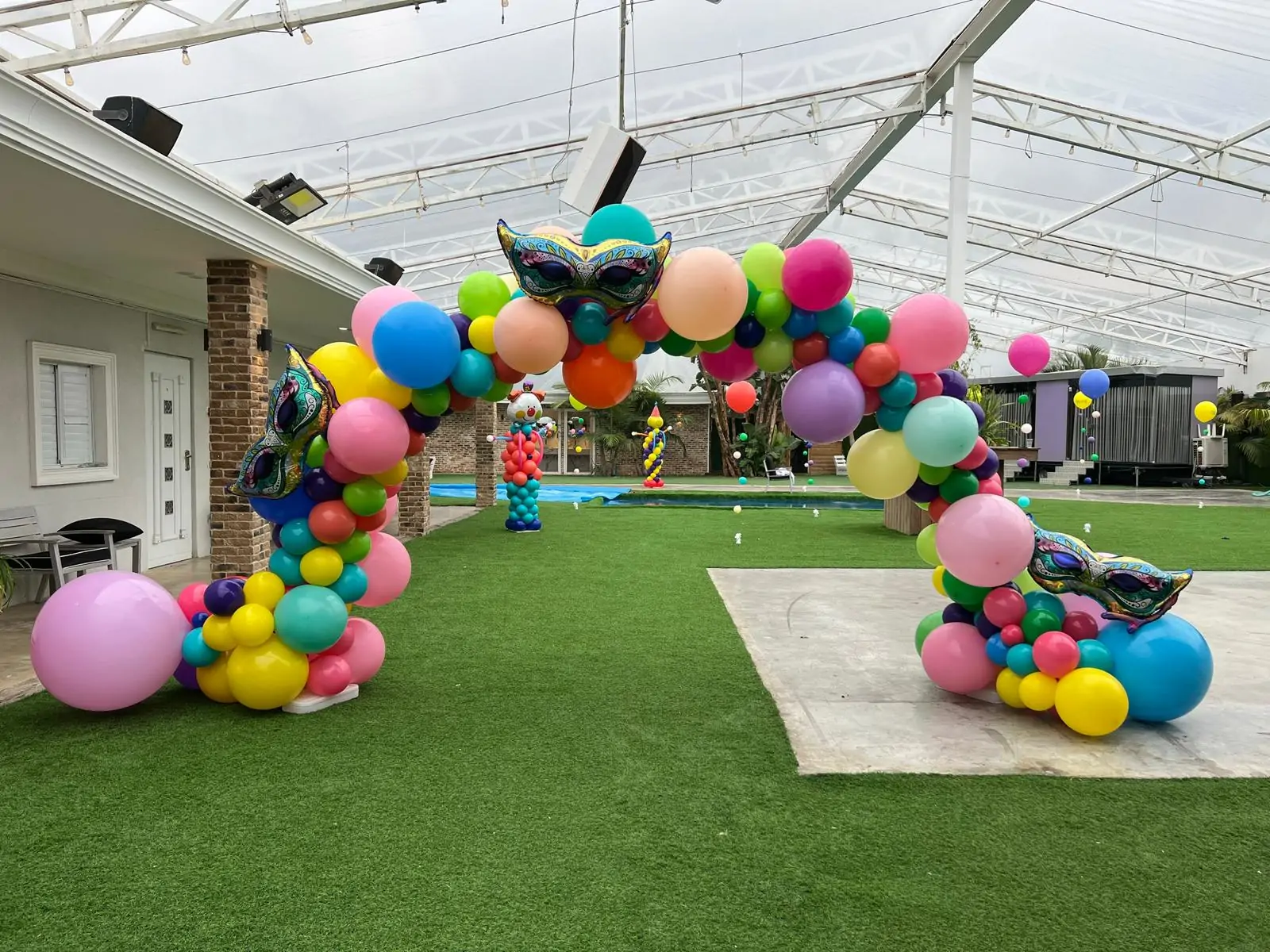 סידור בלונים חגיגי לפורים בצורת שער קשת גדול ועשיר, המורכב מבלונים עגולים בגדלים שונים ובמגוון צבעים ססגוניים. הקשת משלבת מסכות פורים דקורטיביות המשולבות בעיצוב, ויוצרת מראה שמח, קרנבלי ומרשים במיוחד. העיצוב אידיאלי לכניסות לאירועים, חצרות, מתחמי פורים, מסיבות קונספט ואירועים קהילתיים, ומעניק נקודת פתיחה בולטת וצבעונית לאווירת החג.