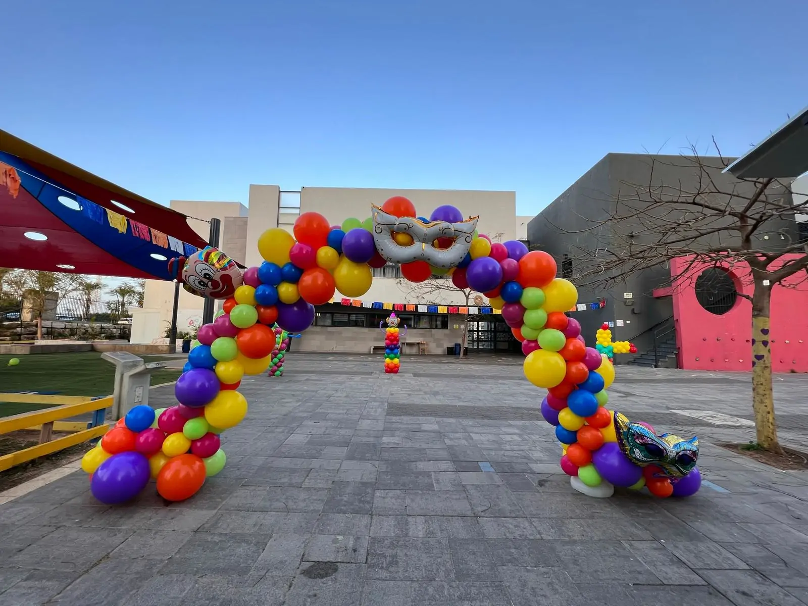 סידור בלונים חגיגי לפורים בצורת שער קשת גדול במיוחד, המעוצב מבלונים עגולים בגדלים שונים ובמגוון צבעי קשת עזים. הקשת משלבת מסכות פורים דקורטיביות המשולבות לאורך העיצוב, ליצירת מראה קרנבלי, שמח ובולט לעין. העיצוב מתאים במיוחד לכניסות למתחמי פורים, חצרות בתי ספר, מתנ"סים, אירועים קהילתיים ואירועי חוץ, ומשמש כנקודת צילום מרכזית ואטרקטיבית לחג.